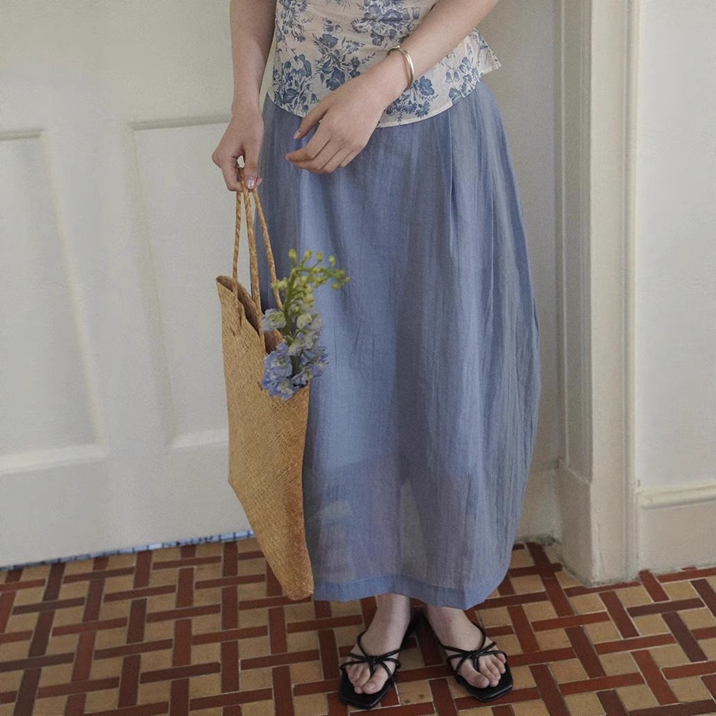 One ment '晨雾'法式双层微透肌理感打褶中长款半身裙女