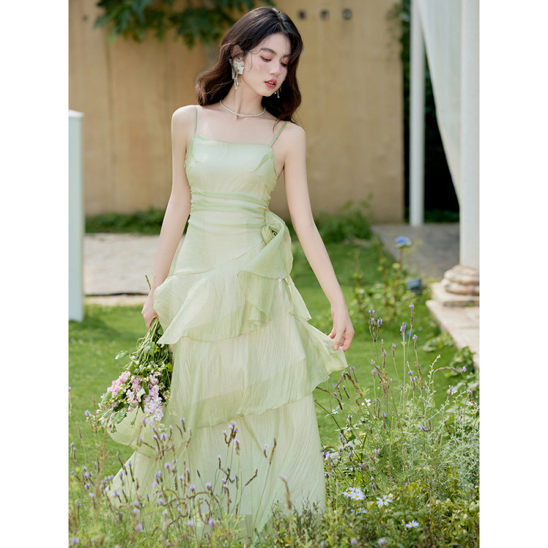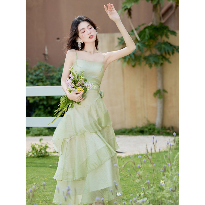 纯欲风不规则荷叶边吊带绿色连衣裙超仙少女减龄收腰森系蛋糕长裙