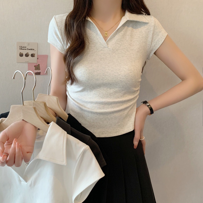 卡腰显瘦polo领短上衣女夏季小众抽褶甜辣V领正肩短袖白色T恤
