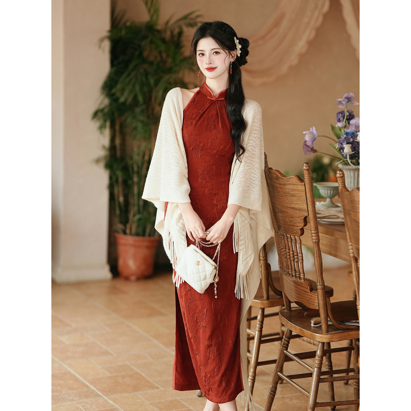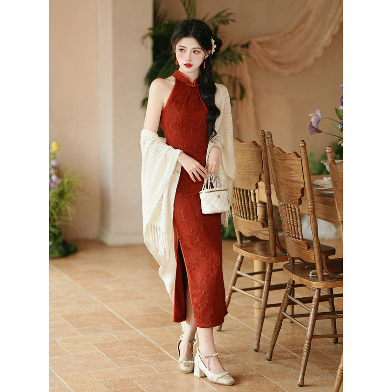 复古红色暗纹显瘦旗袍裙新中式气质挂脖连衣裙订婚礼服套装女