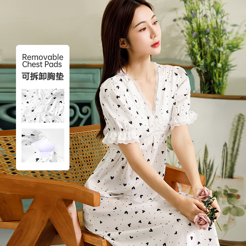 仿真丝性感V领短袖睡裙印花睡衣带胸垫女士春夏季新款冰丝长裙