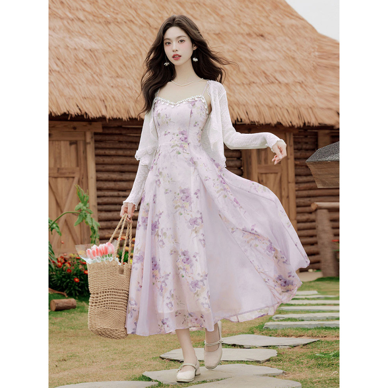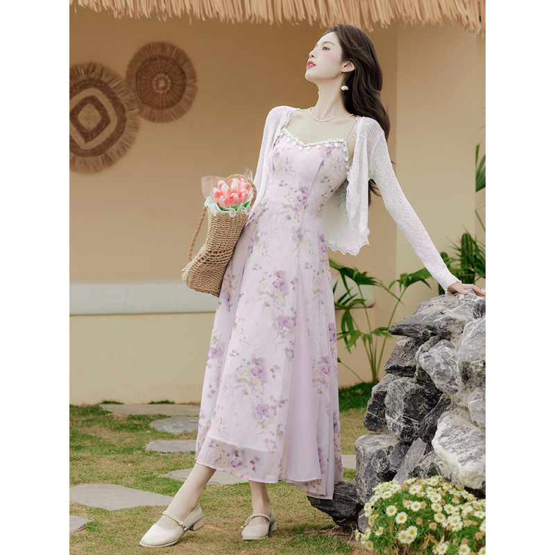 法式绝美温柔风晕染吊带连衣裙防晒开衫两件套纯欲风海边度假穿搭