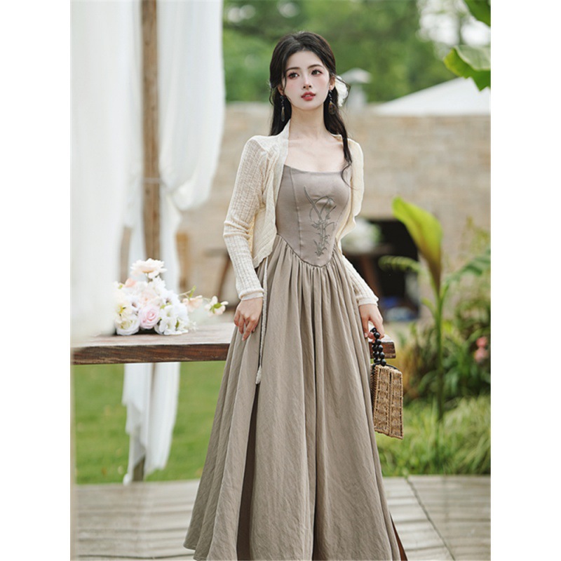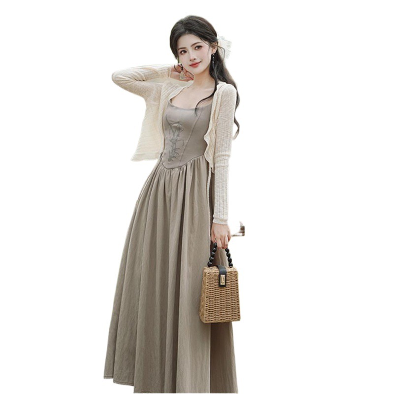 法式圆弧刺绣连衣裙开衫两件套女夏季新款收腰长裙百搭吊带裙淑女