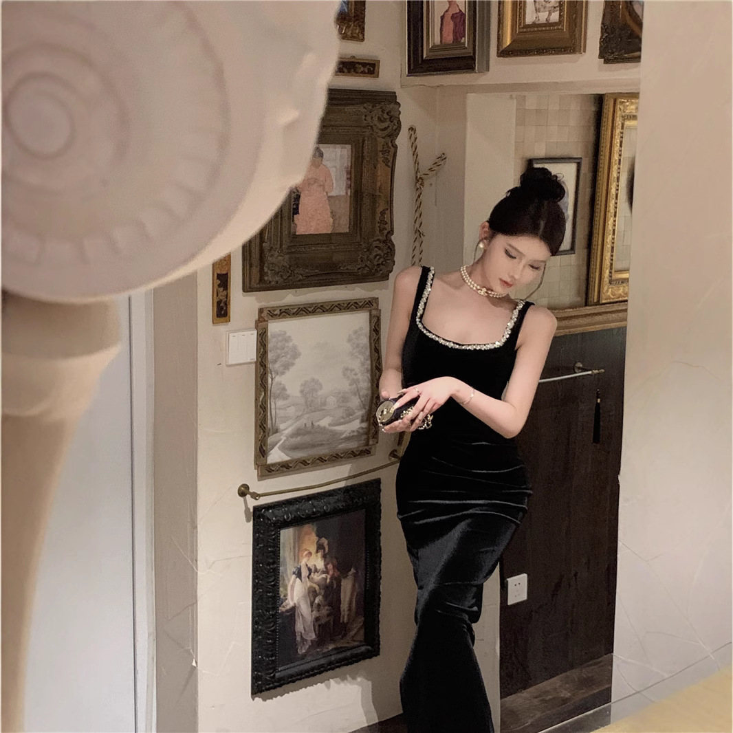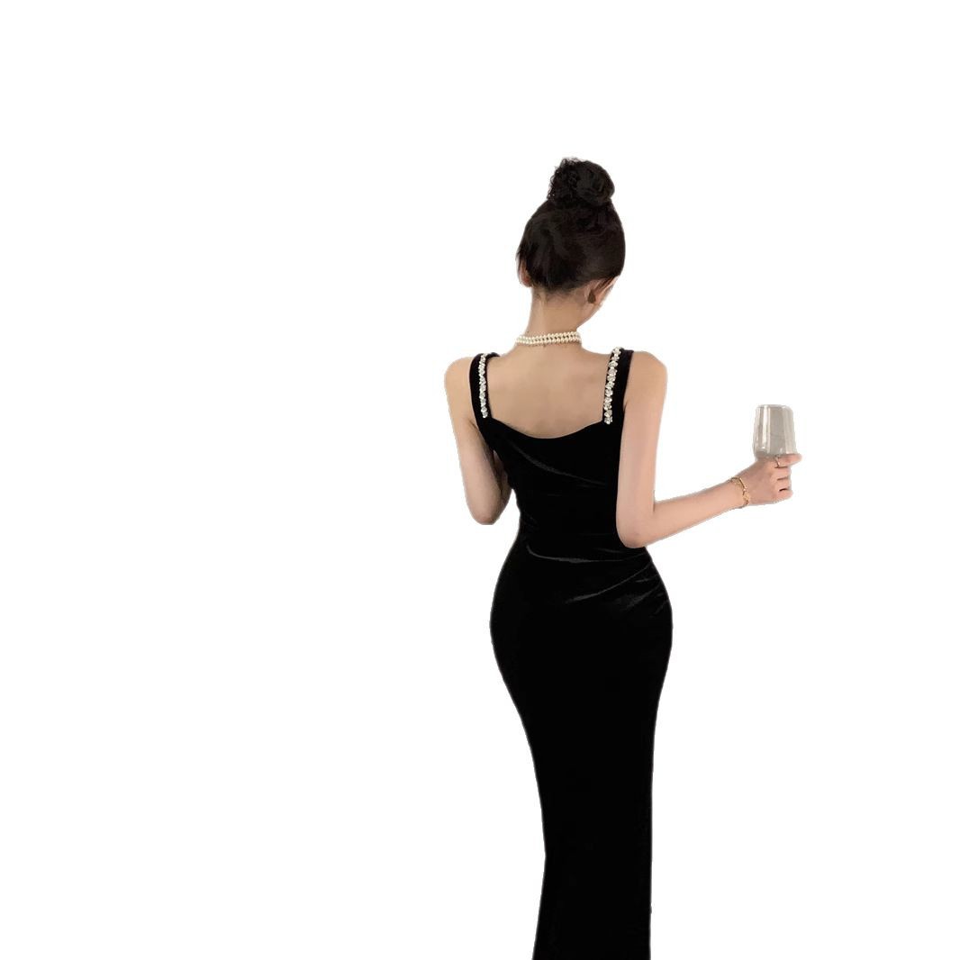 生日晚宴赫本风礼服高级感修身开叉镶钻黑色丝绒吊带连衣裙女长款