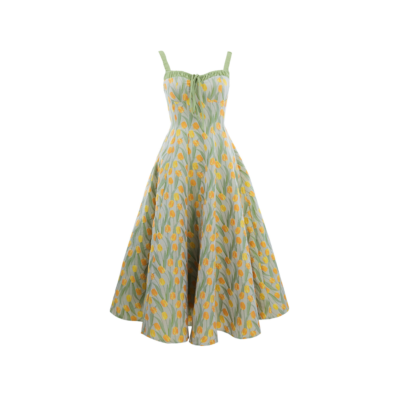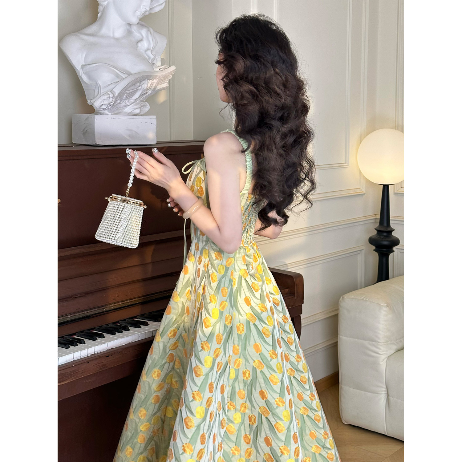 开春浅绿碎花复古吊带裙法式高腰修身气质花朵连衣裙女夏SS