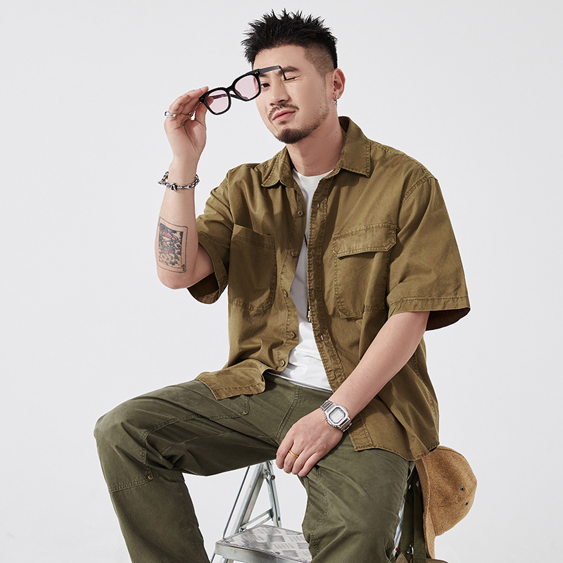 2025新款日系复古工装短袖衬衫男宽松休闲美式夏季潮流衬衣