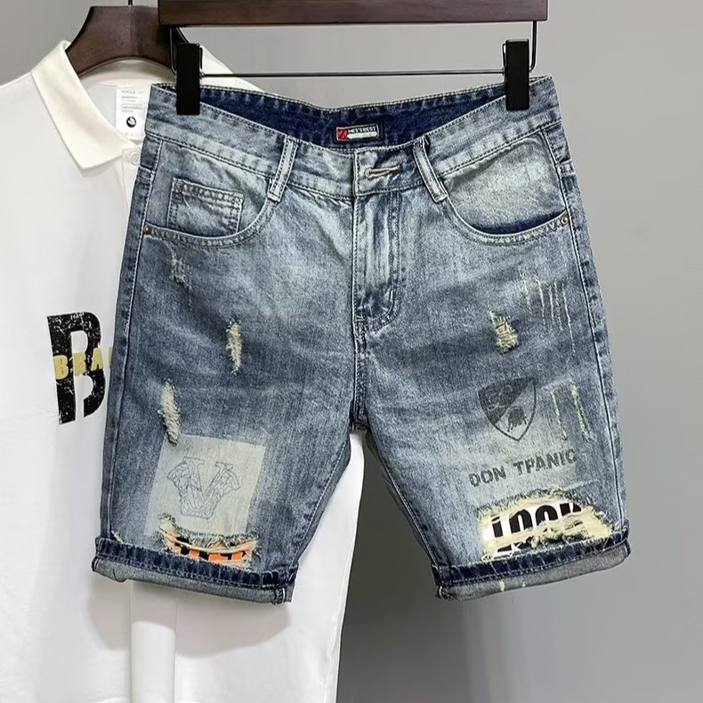 潮牌牛仔短裤男破洞泼墨涂鸦五分修身直筒韩版重磅洗水中裤