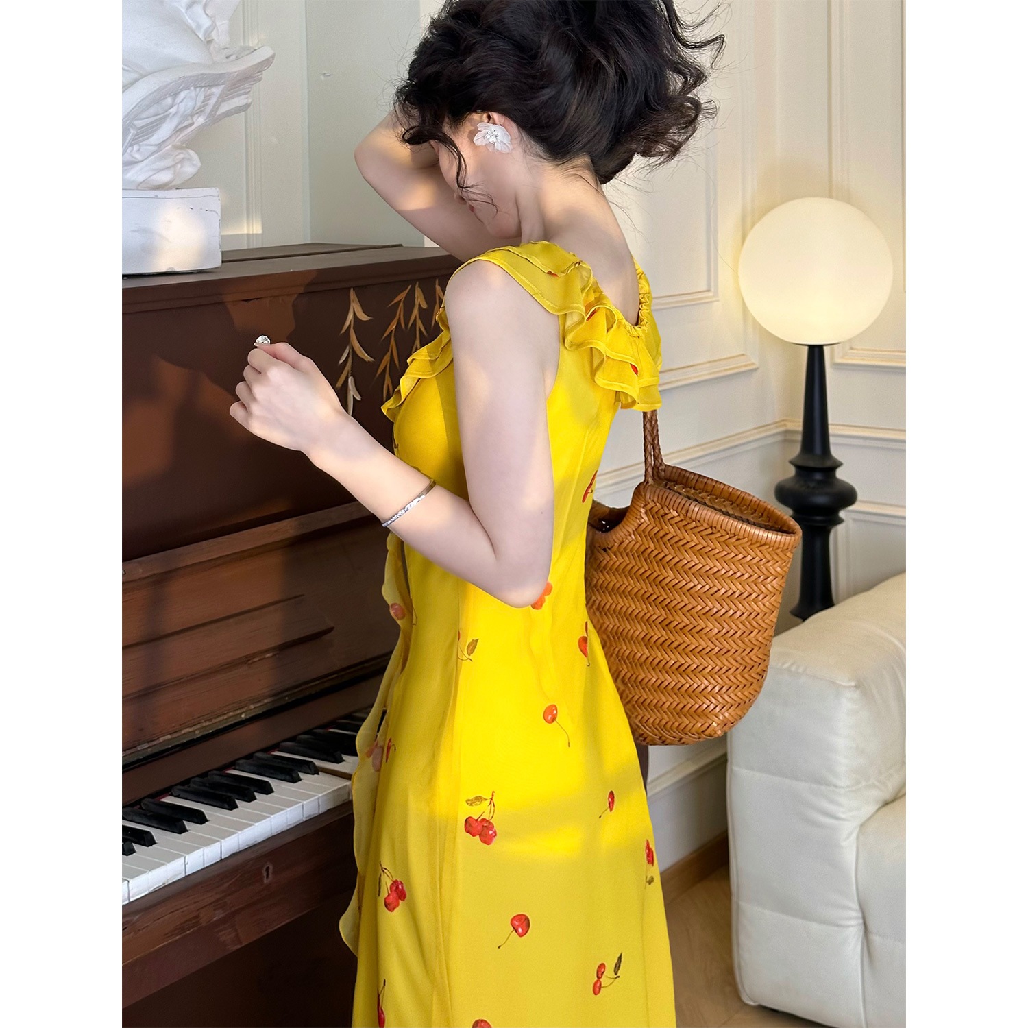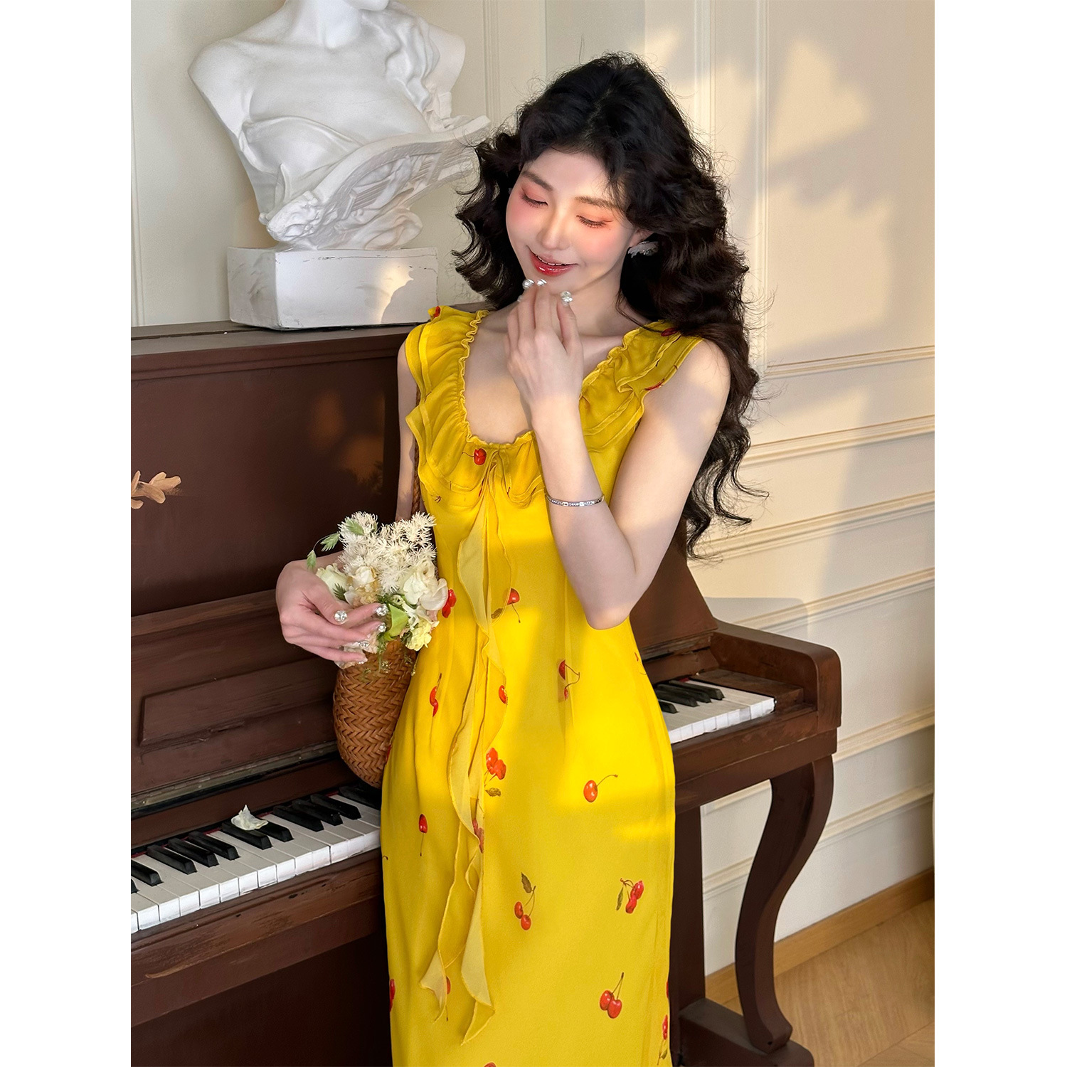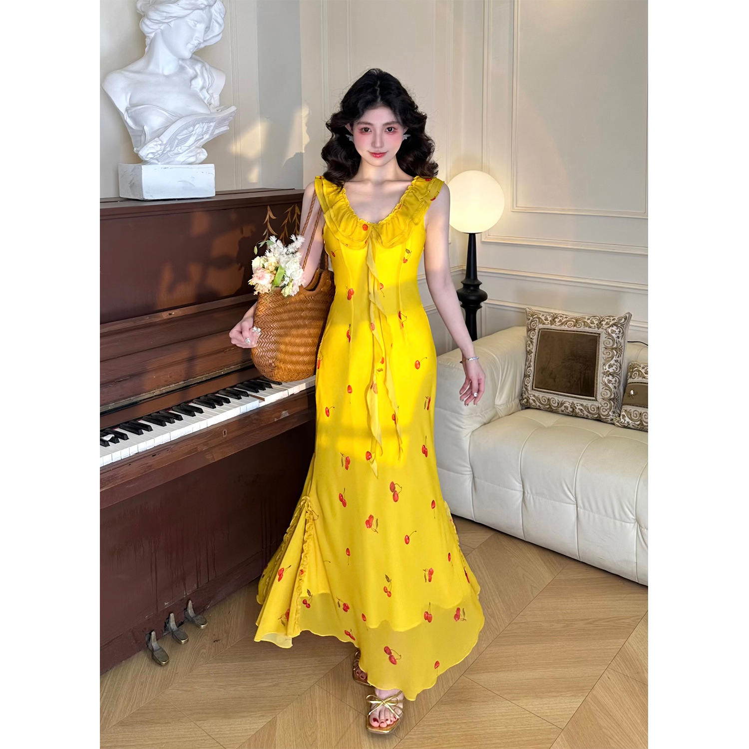 法式吊带裙气质U领碎花鱼尾裙显瘦温柔风高腰连衣裙女夏SS