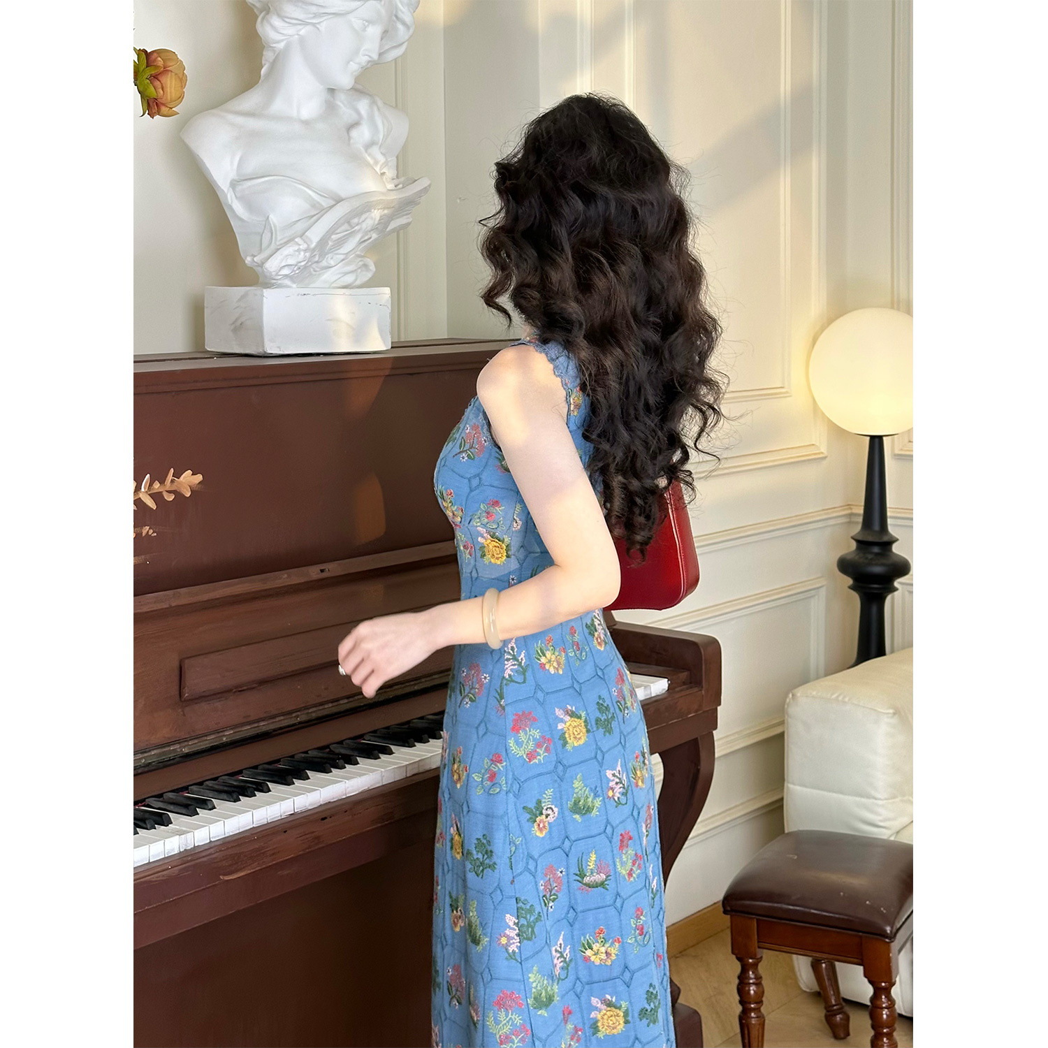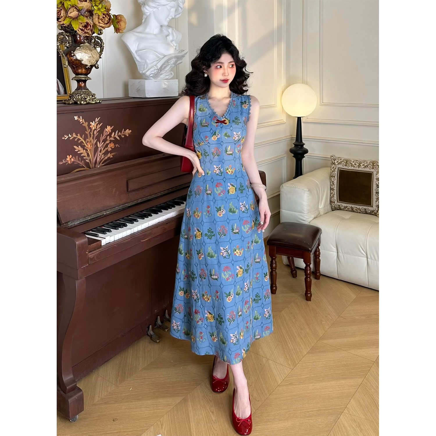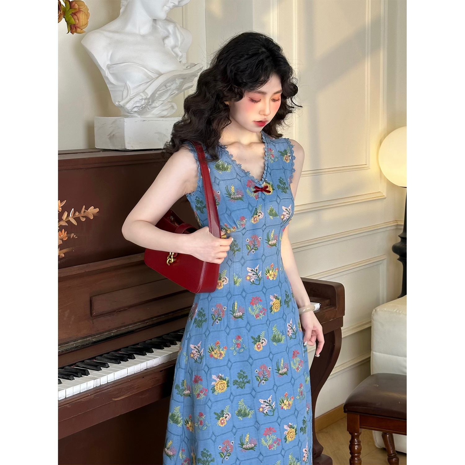 法式V领吊带裙春夏新款气质收腰显瘦复古碎花连衣裙女SS