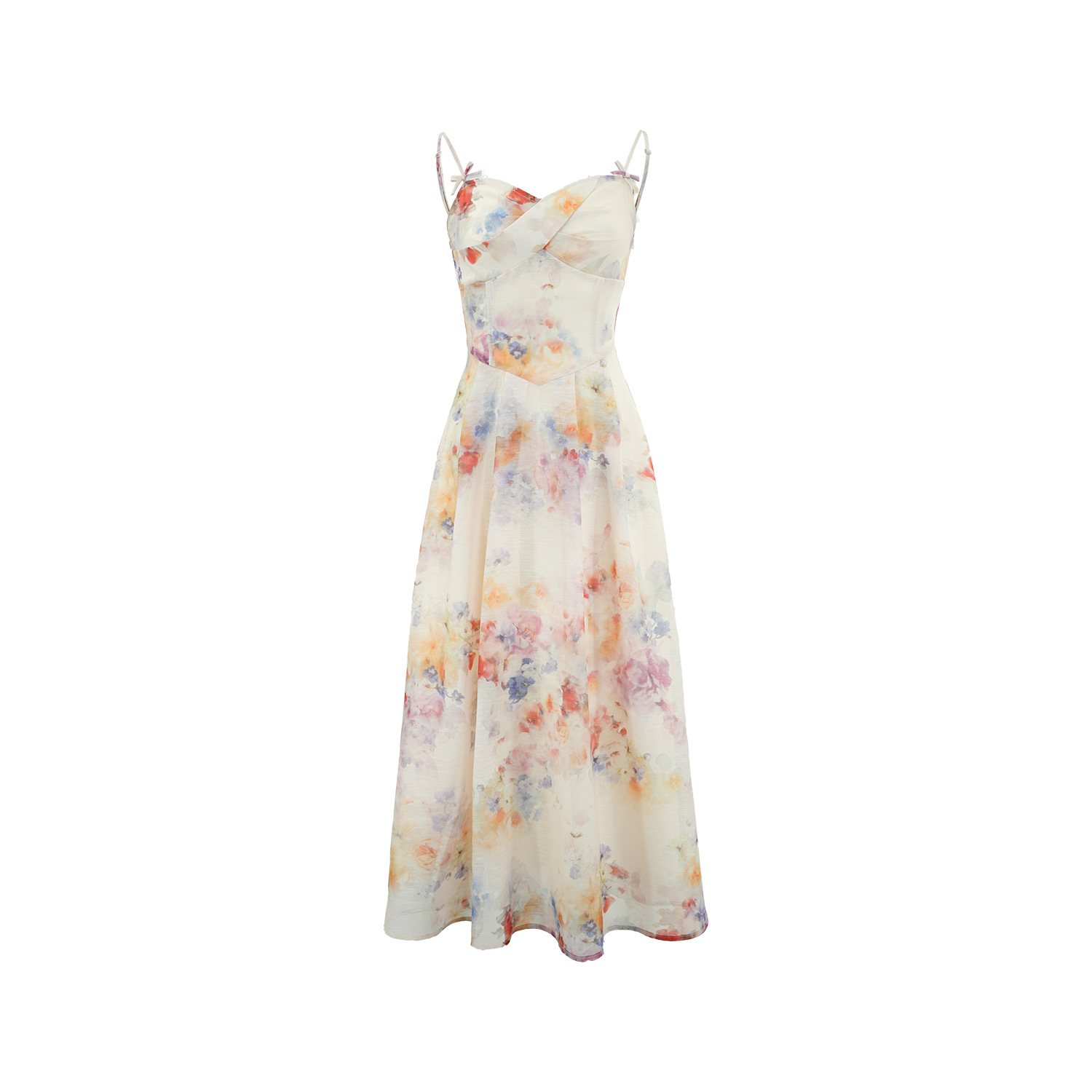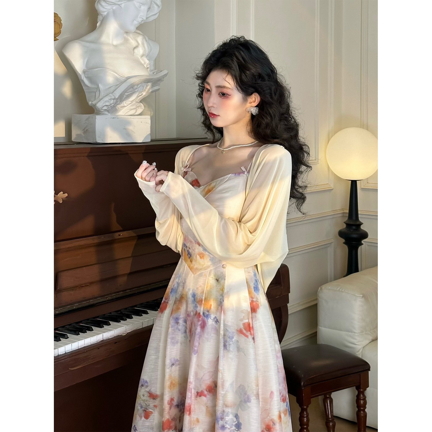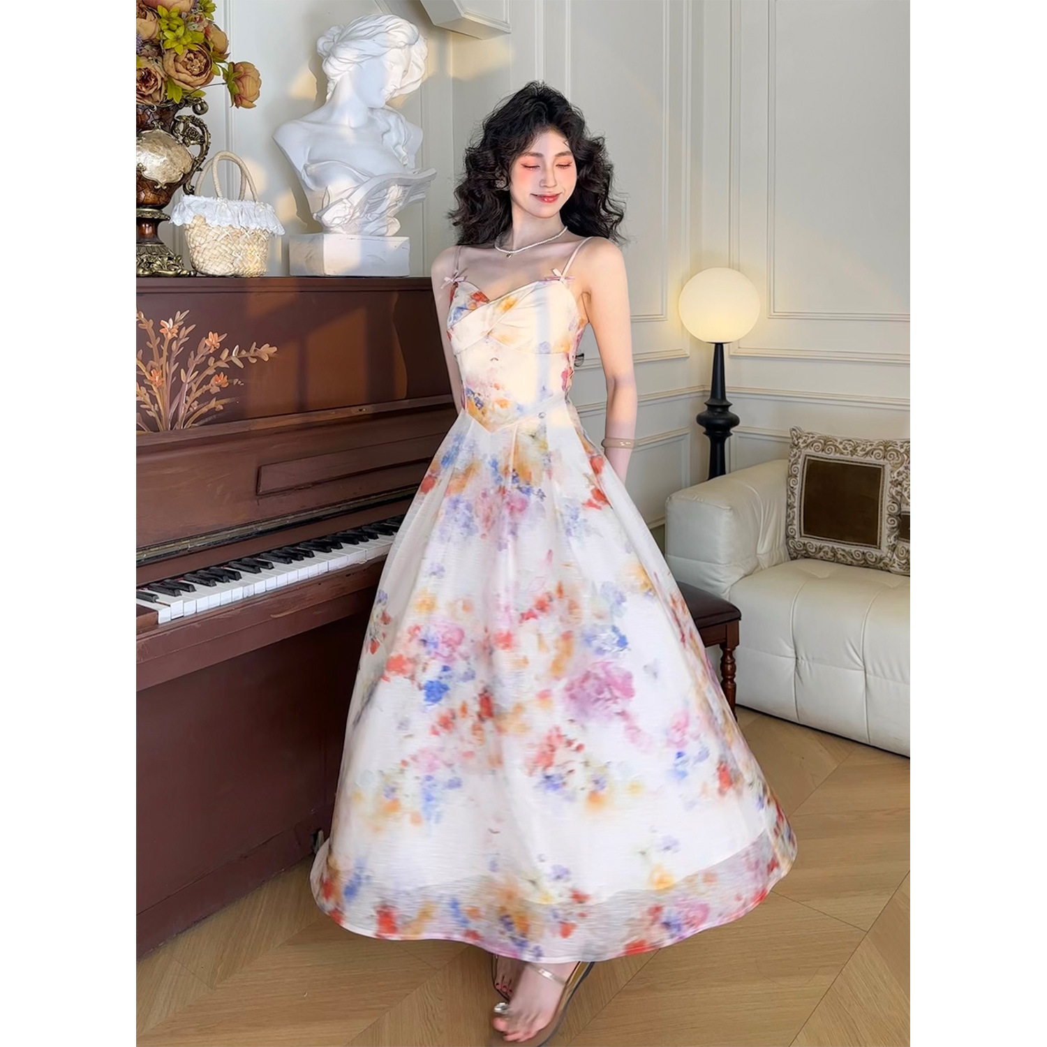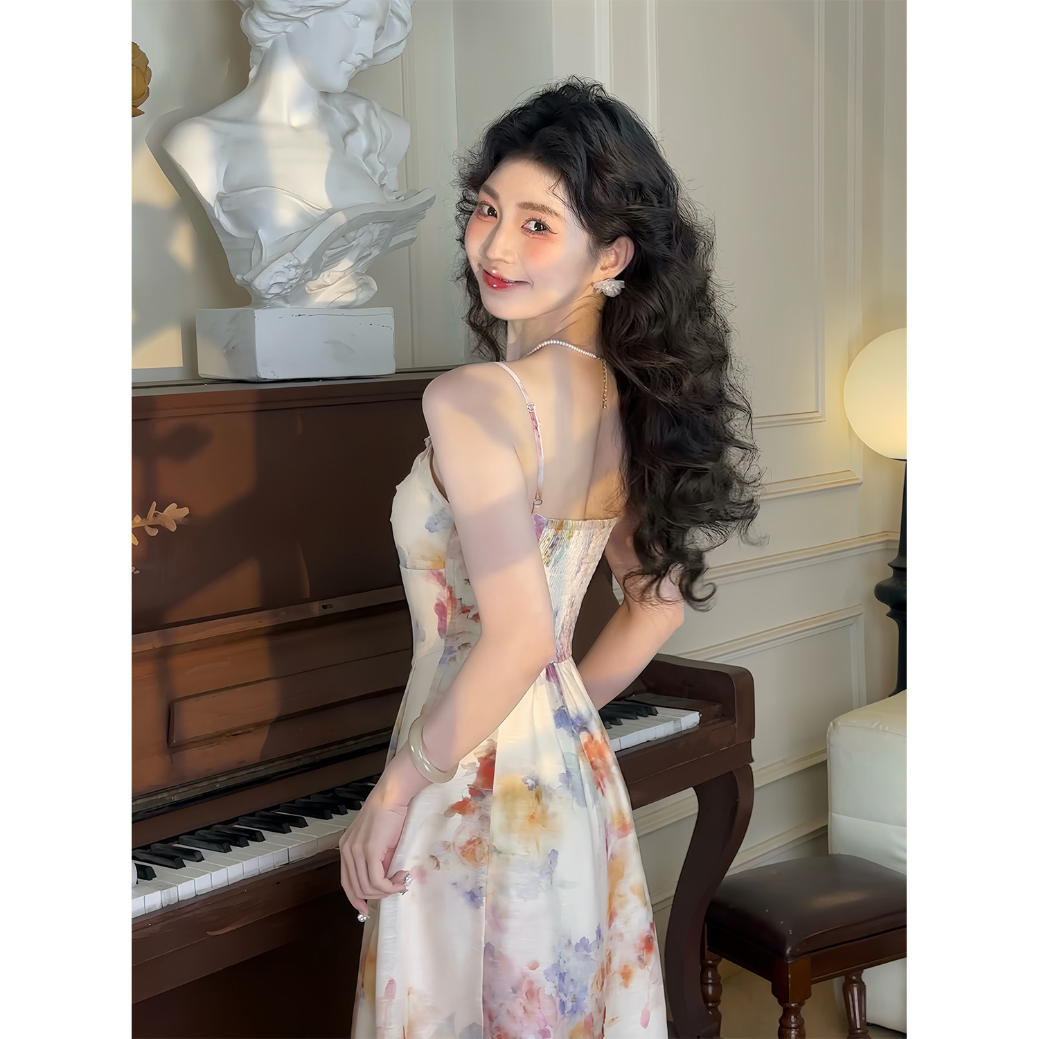 法式V领气质复古吊带裙春夏温柔风高腰大摆碎花连衣裙女SS