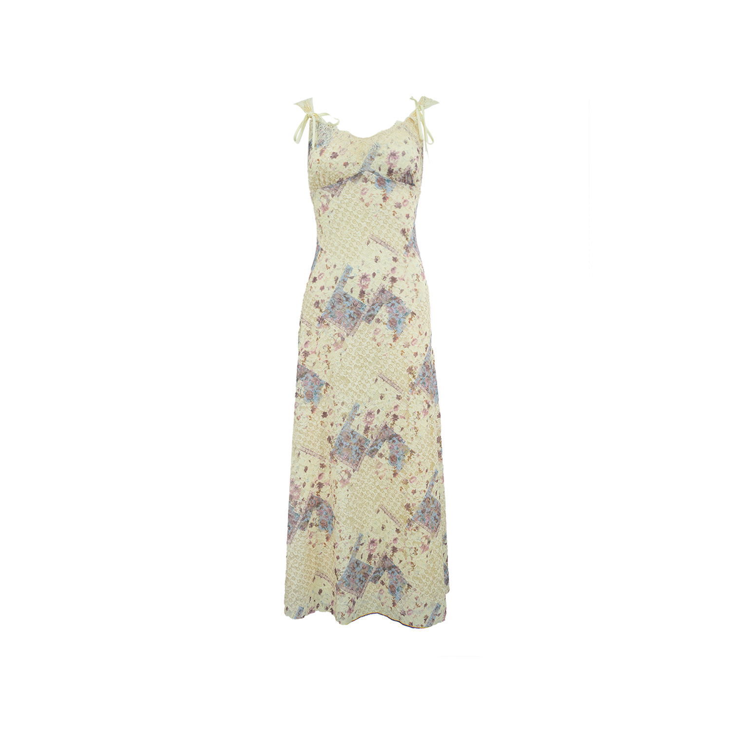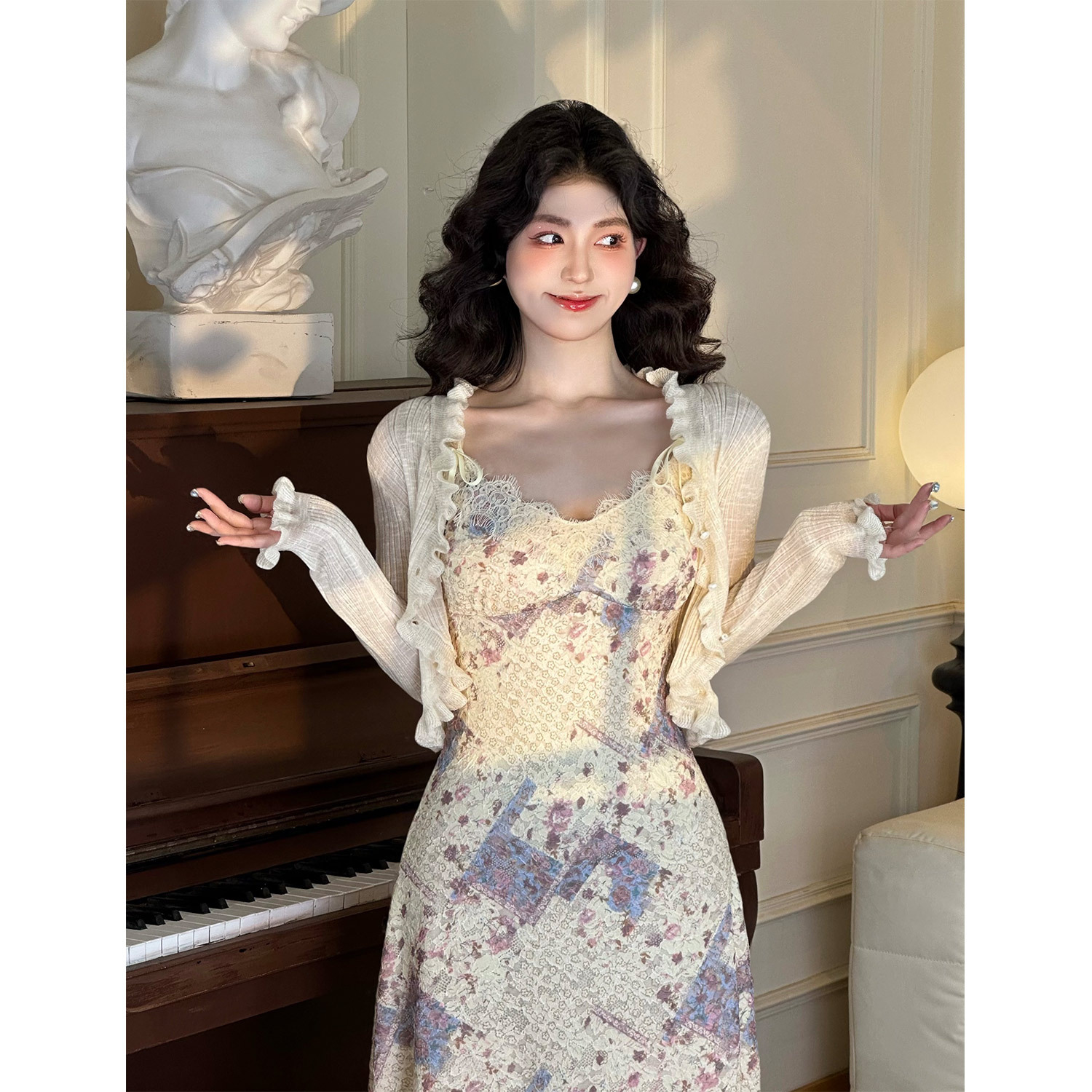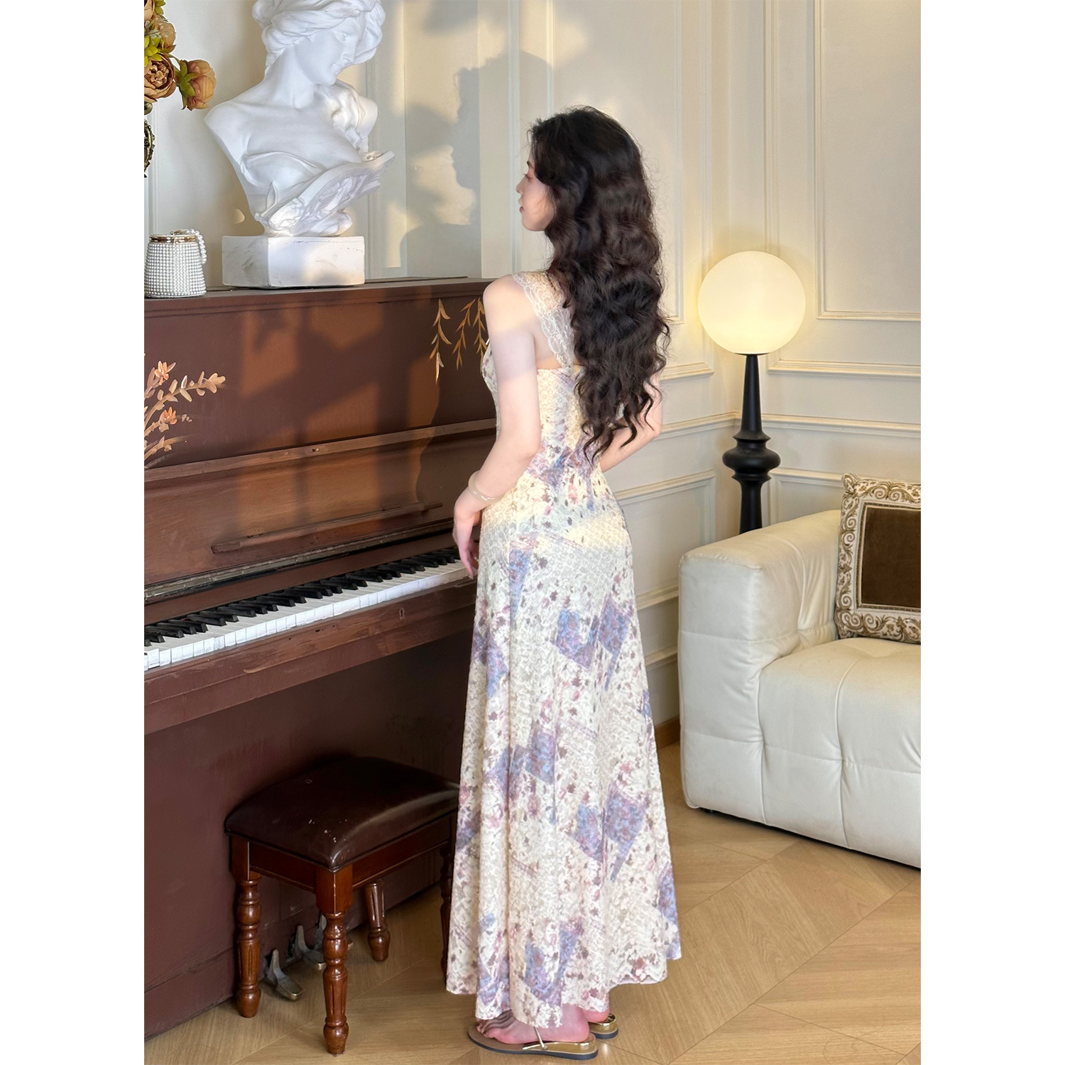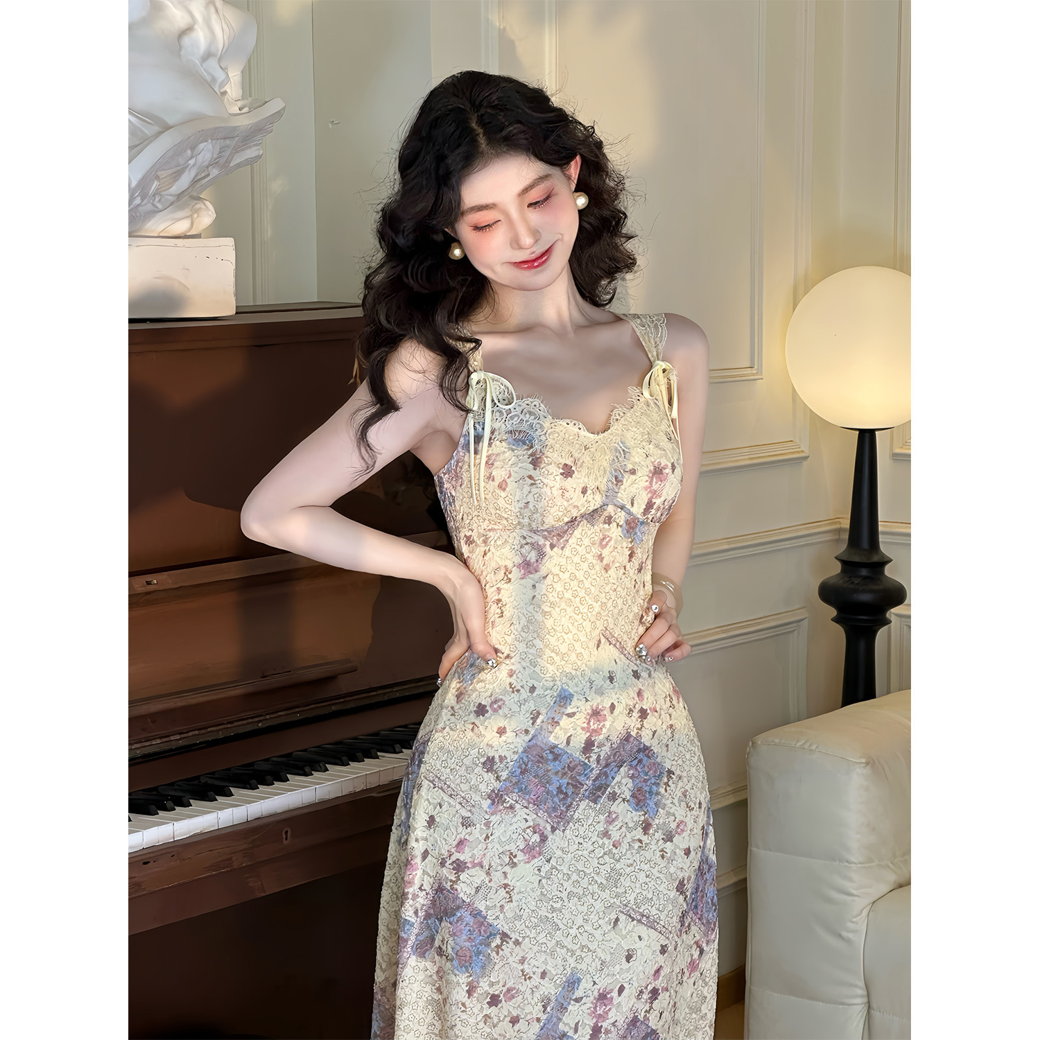 法式V领镂空气质系带吊带裙春夏复古蕾丝拼接连衣裙女SS