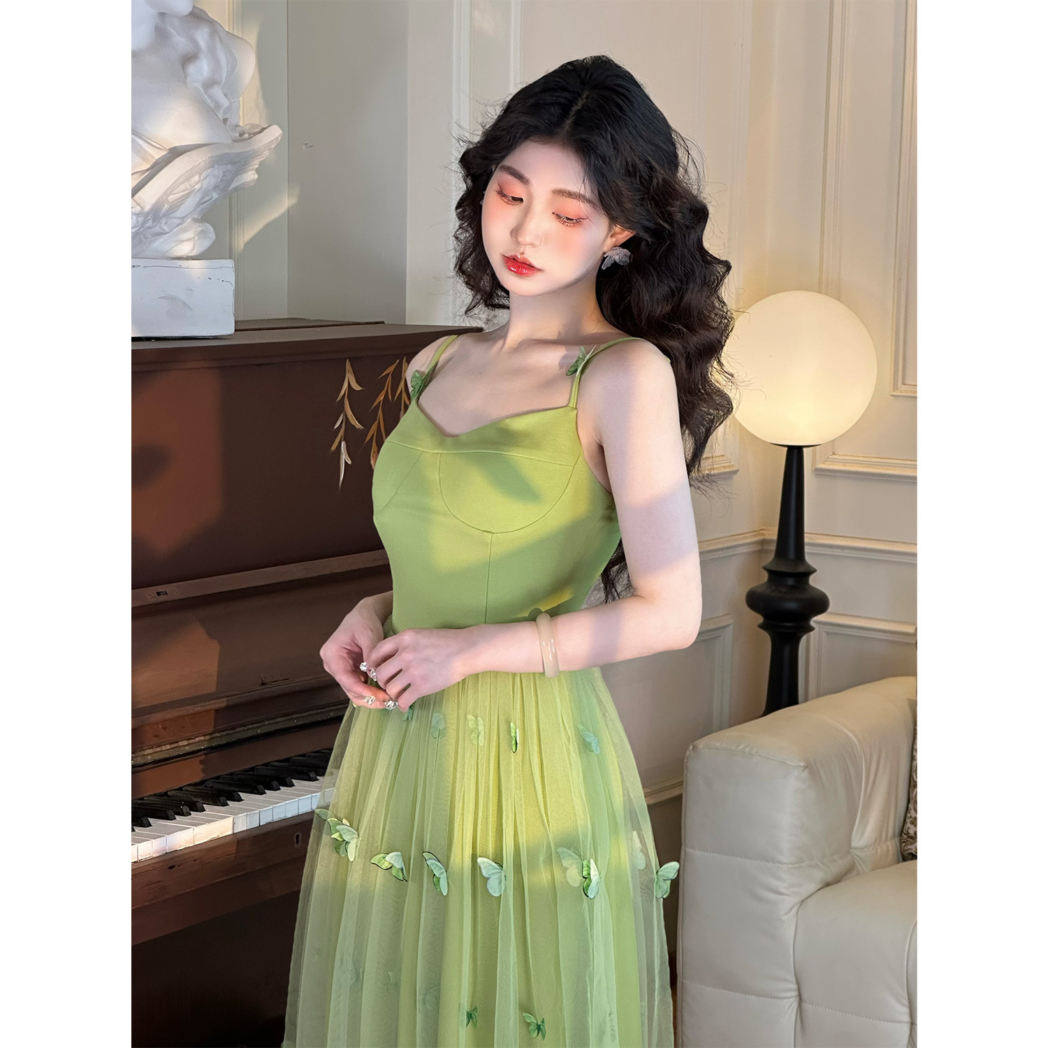 复古高腰温柔风中长款裙子蕾丝拼接玫瑰法式吊带连衣裙女SS