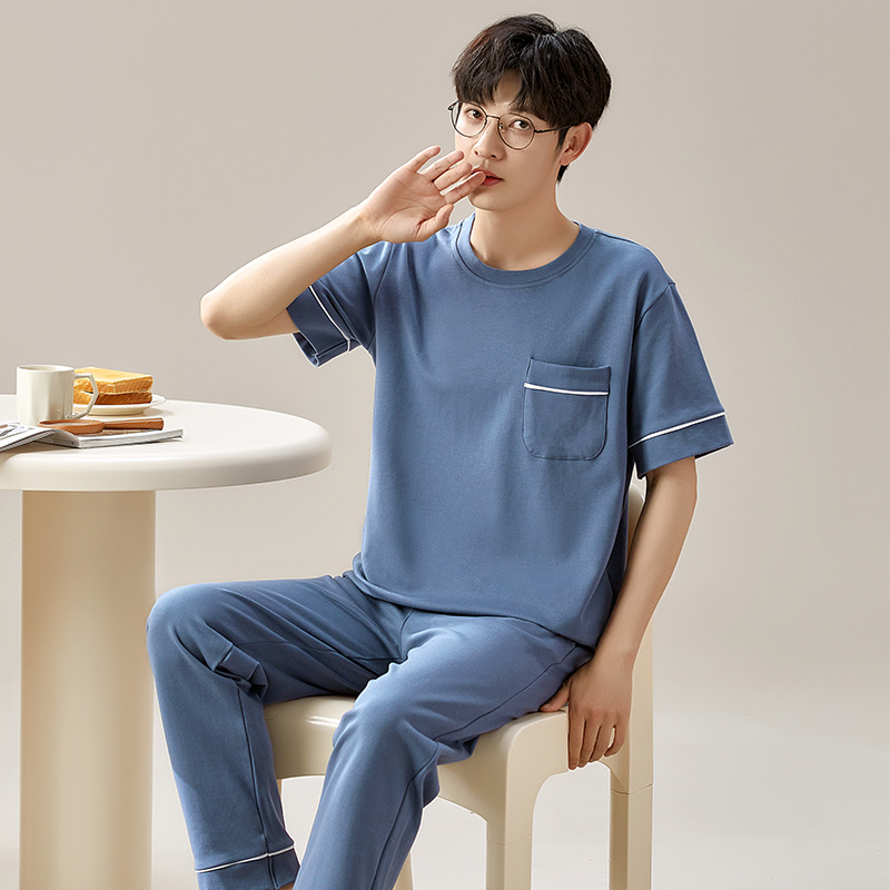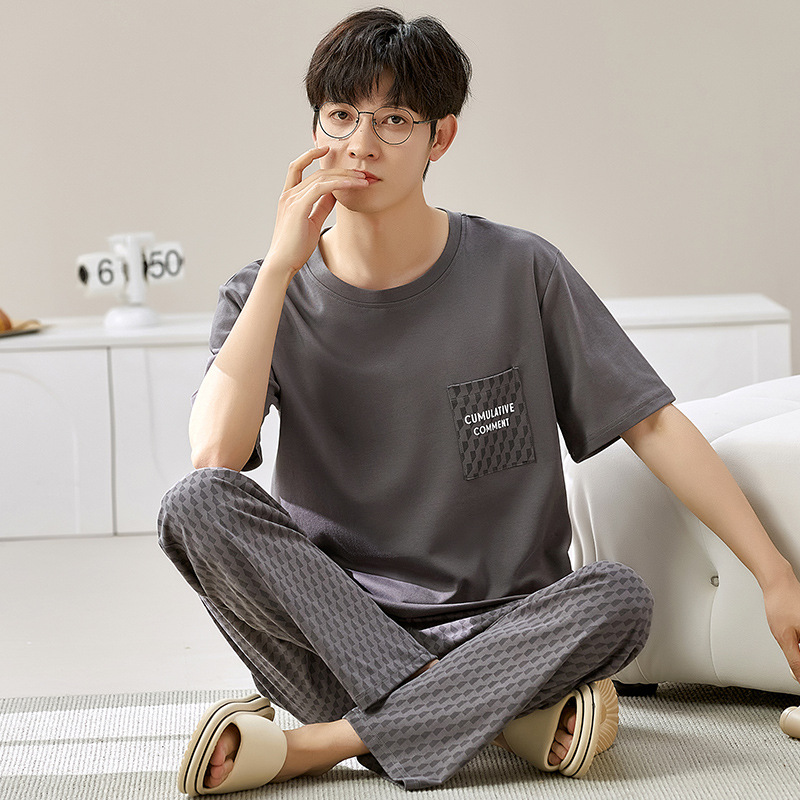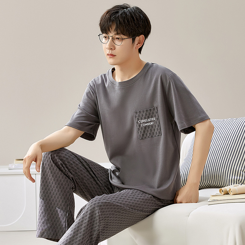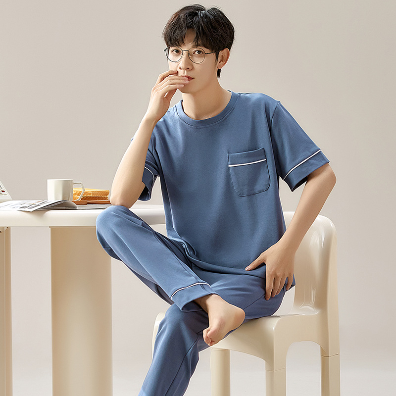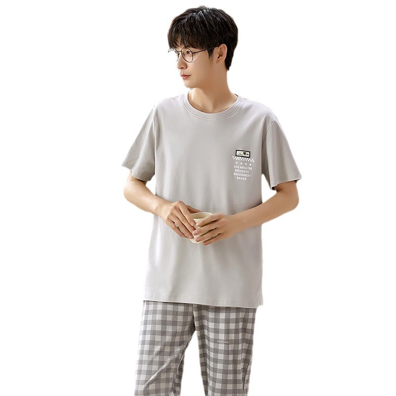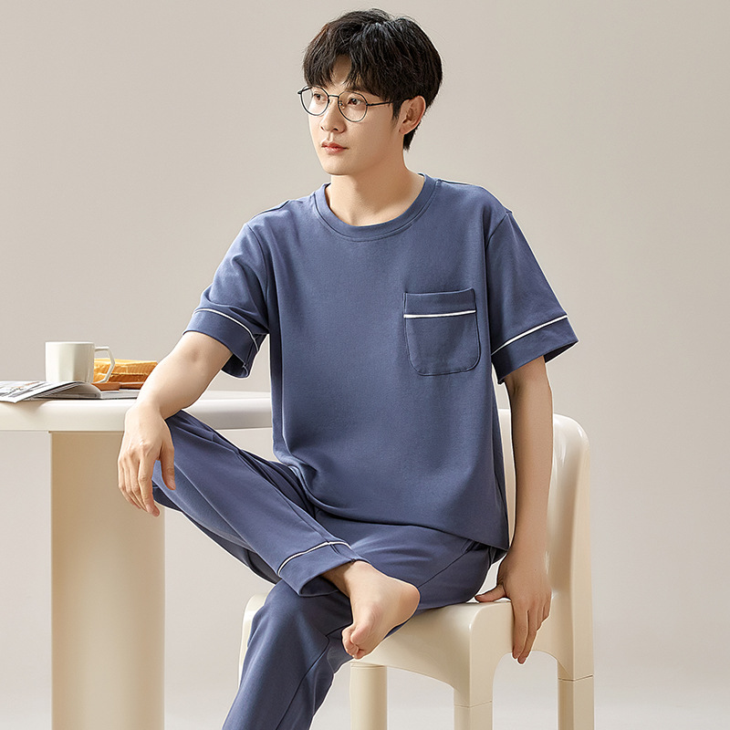 春夏款纯棉男士睡衣短袖长裤休闲套装新款夏季套头家居服男