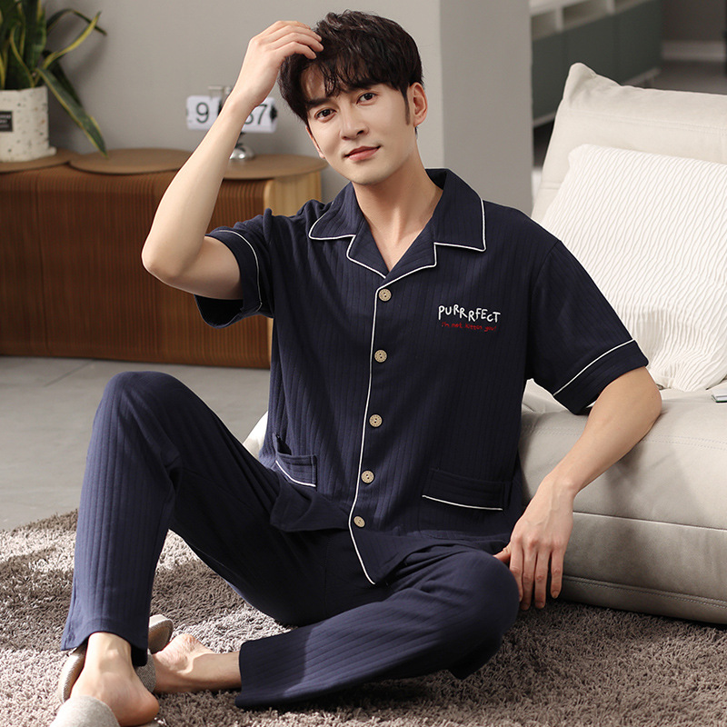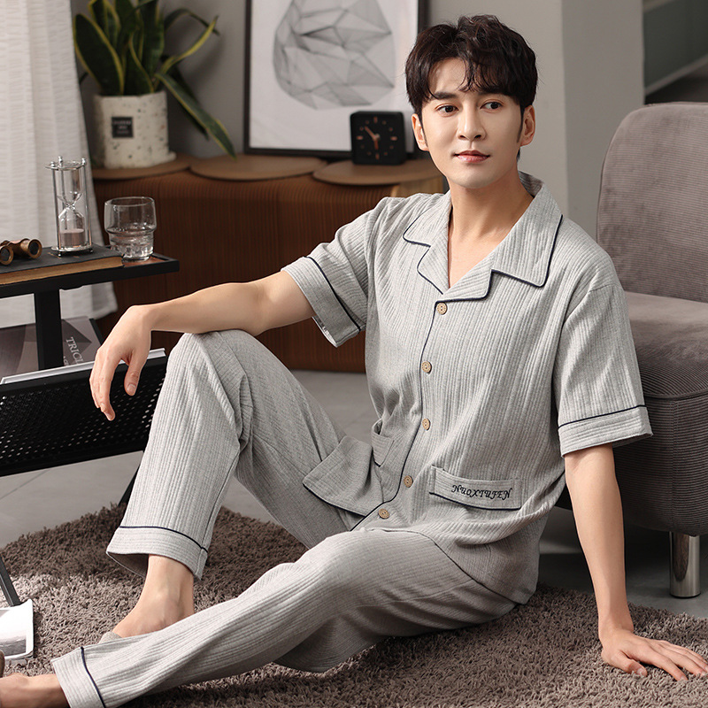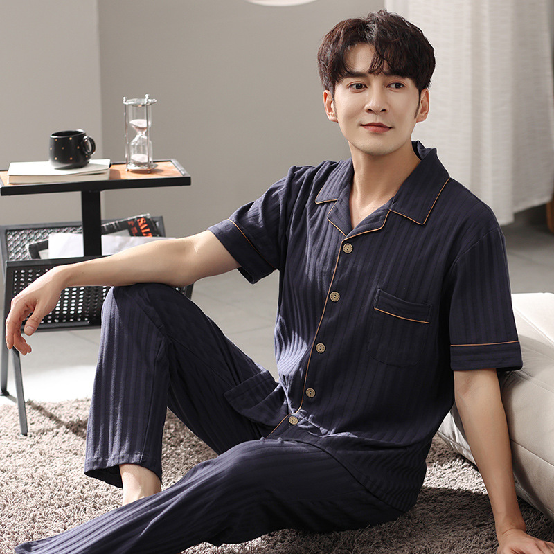 针织棉 简约竖纹男士翻领开衫短袖长裤春夏薄款家居服