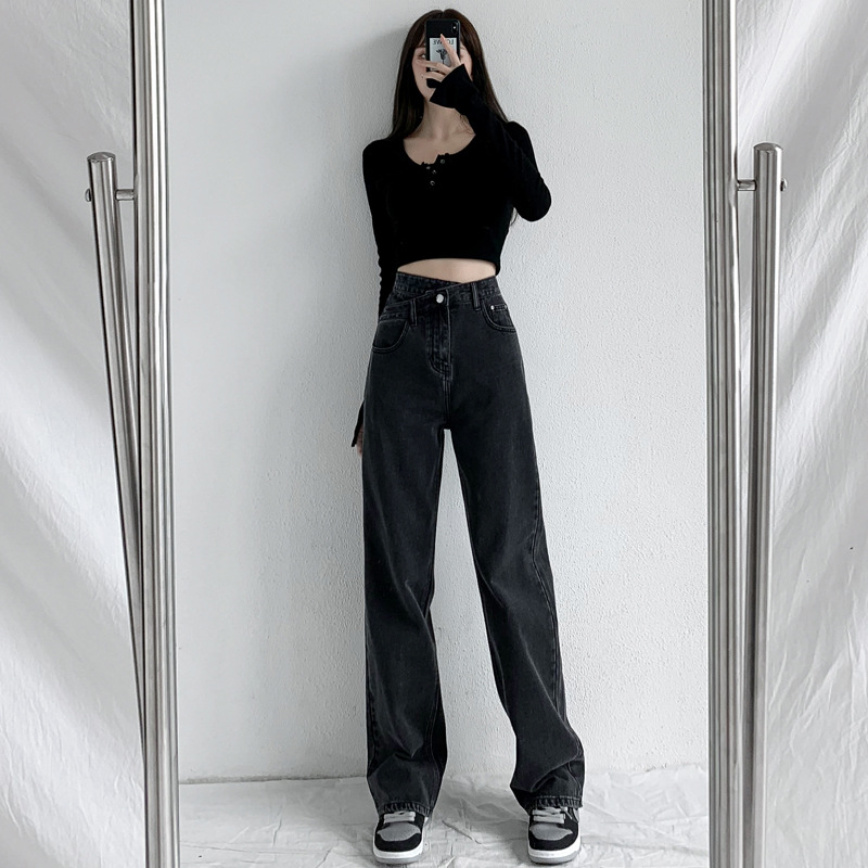 阔腿牛仔裤女春夏新款宽松高腰直筒拖地设计感交叉腰头复古