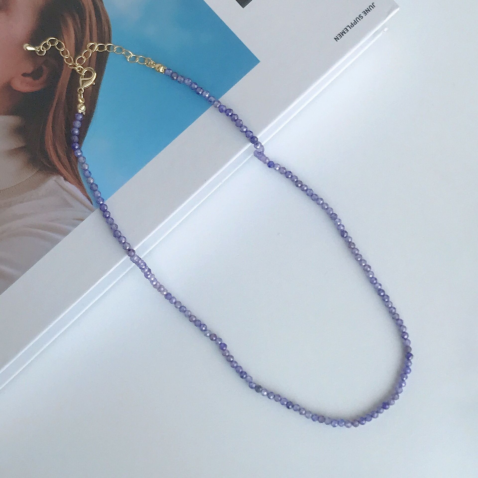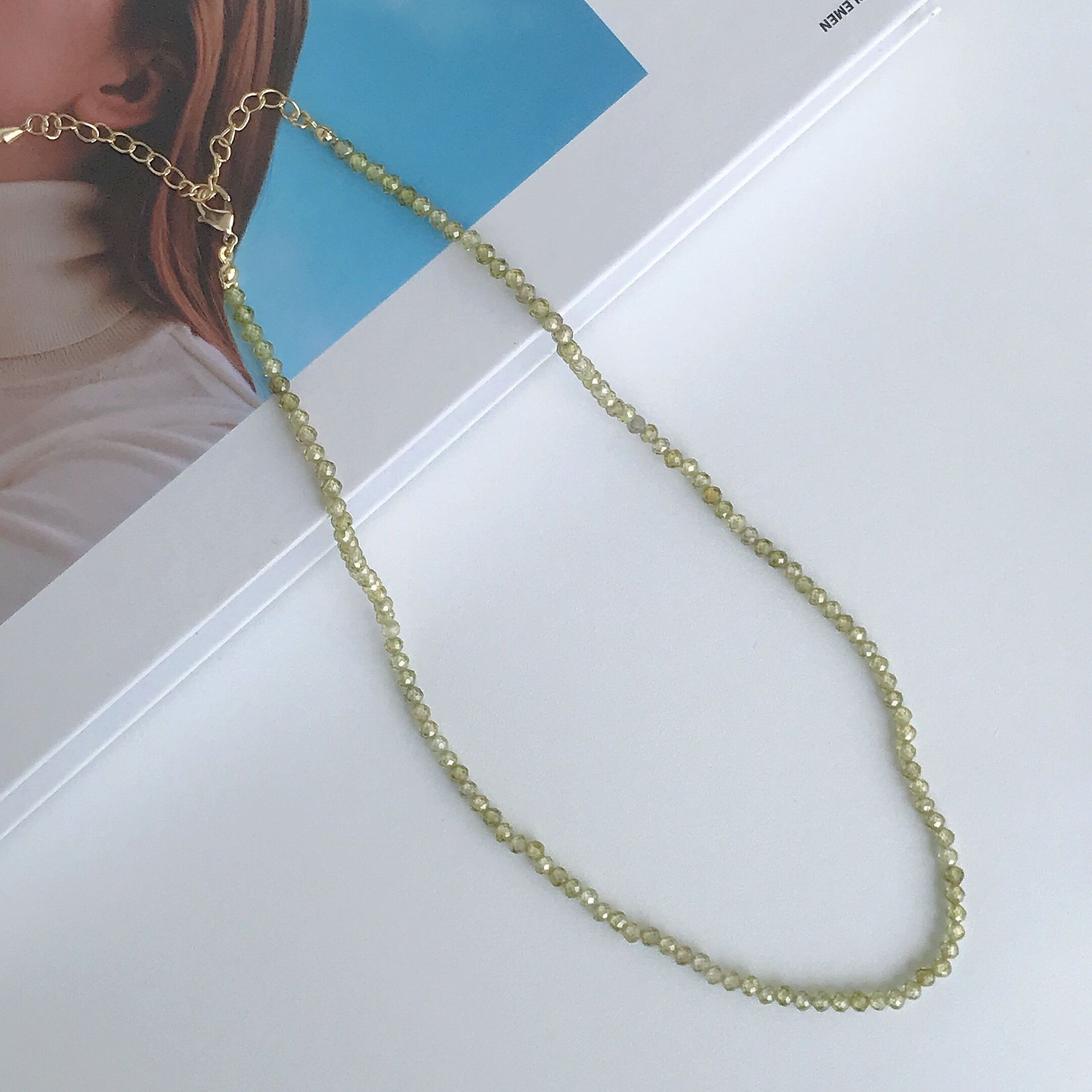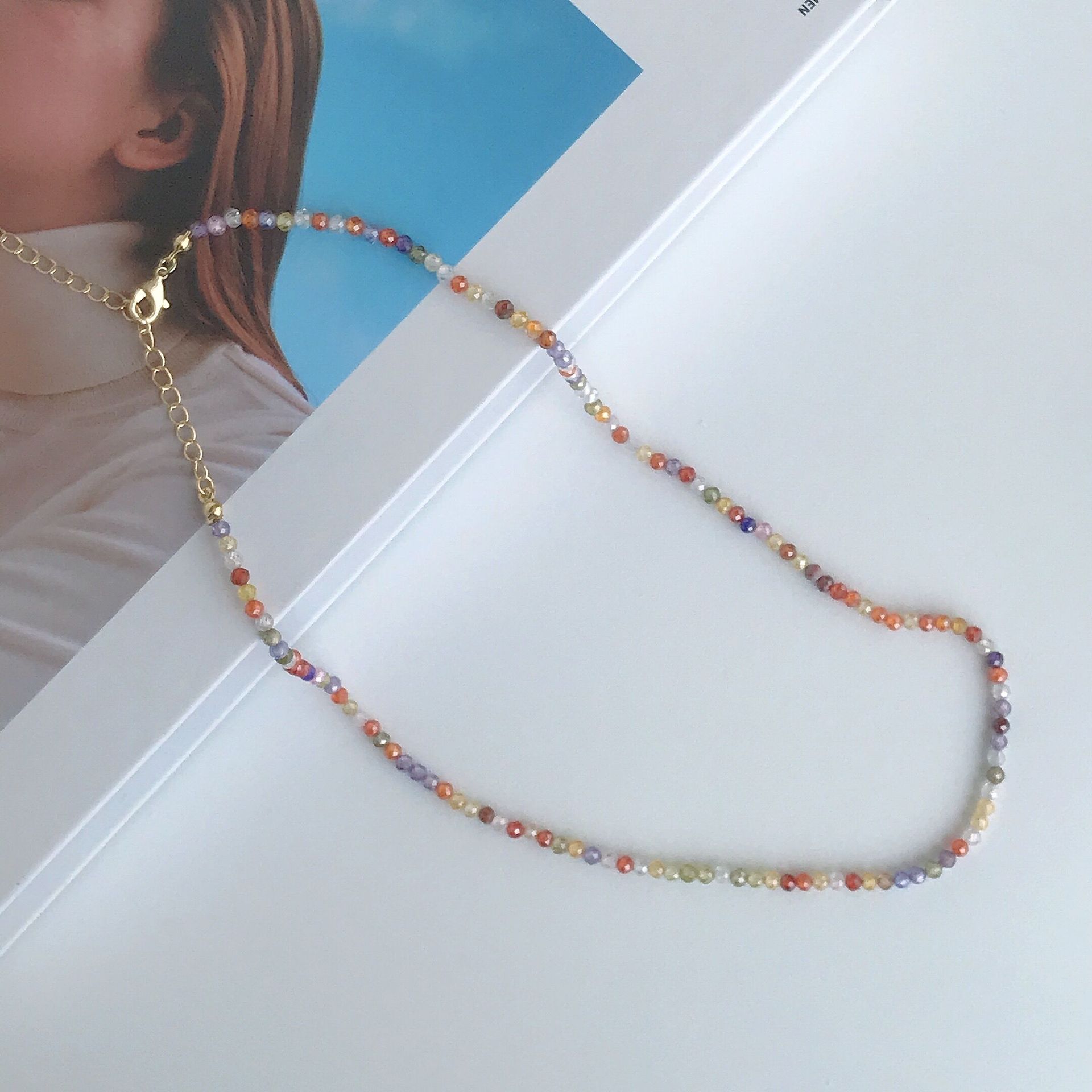 春夏彩色串珠项链女可叠戴小众设计高级百搭简约猫眼石锆石锁