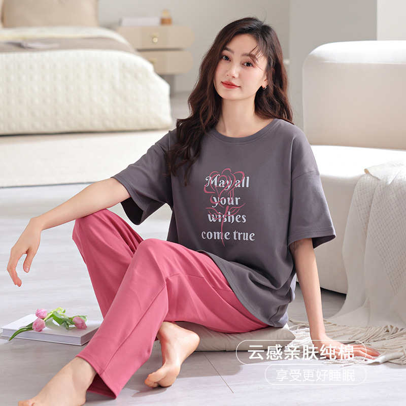 纯棉睡衣女夏季短袖长裤可外穿休闲宽松圆领全棉家居服新款