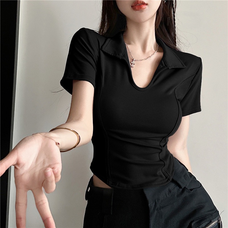 罗纹短袖t恤女2025新款洋气时髦新款夏季显瘦修身小U领上衣polo衫