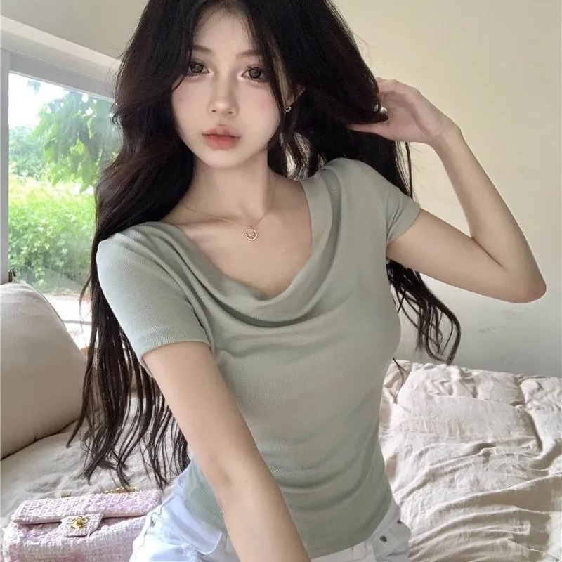 纯欲风一字肩短袖T恤女装夏季辣妹褶皱修身显瘦短款别致上衣