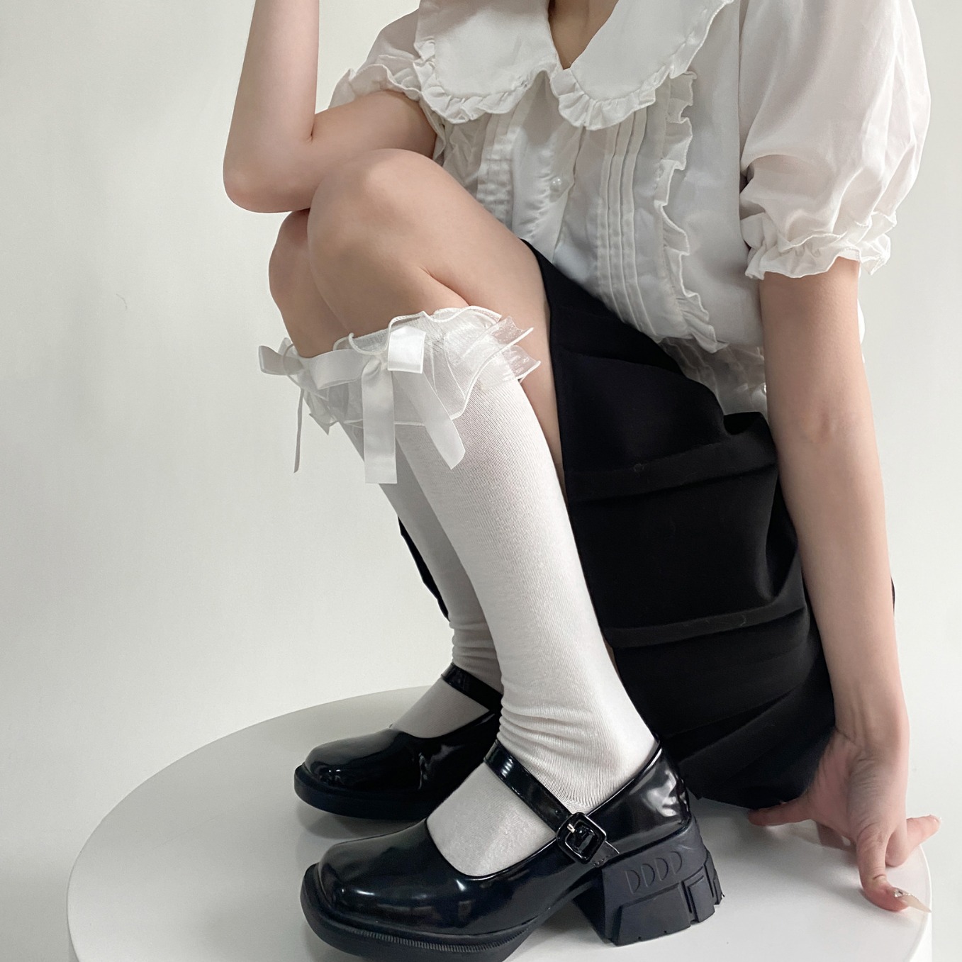 日系春秋可爱奶白色蝴蝶结欧根纱蓬蓬花边针织棉小腿袜子女甜美风