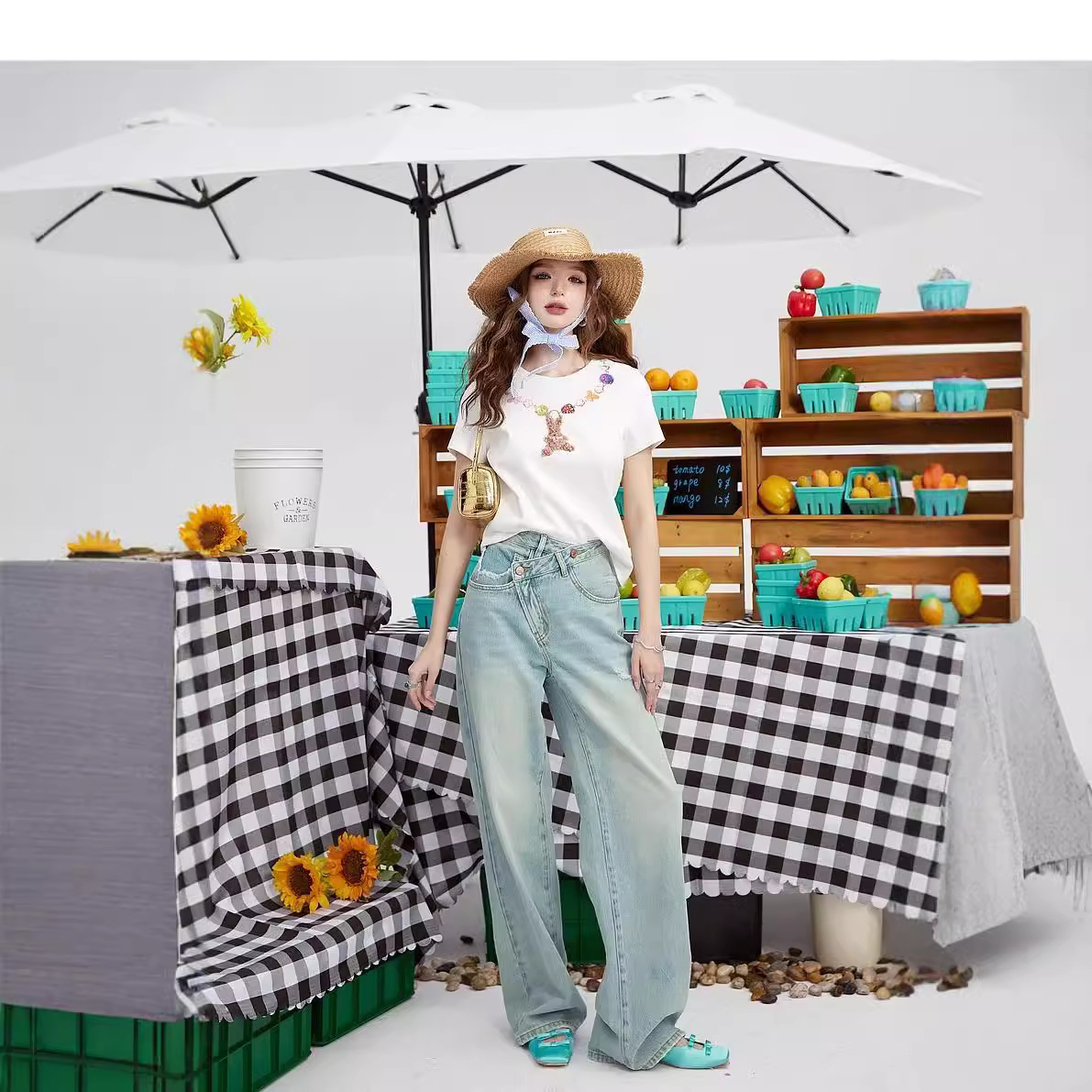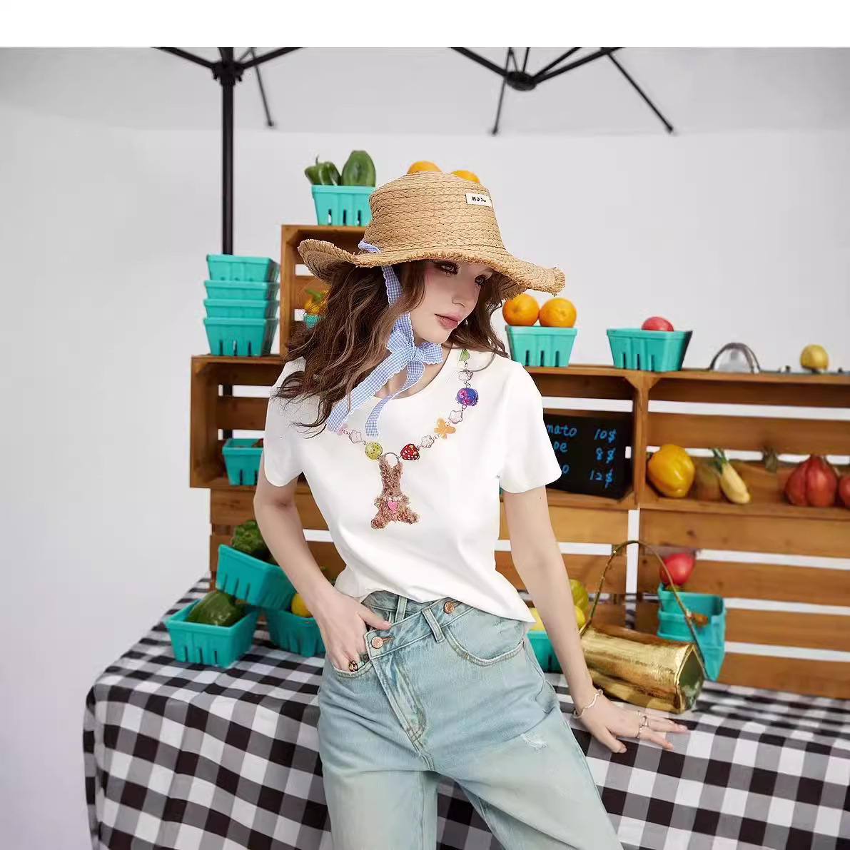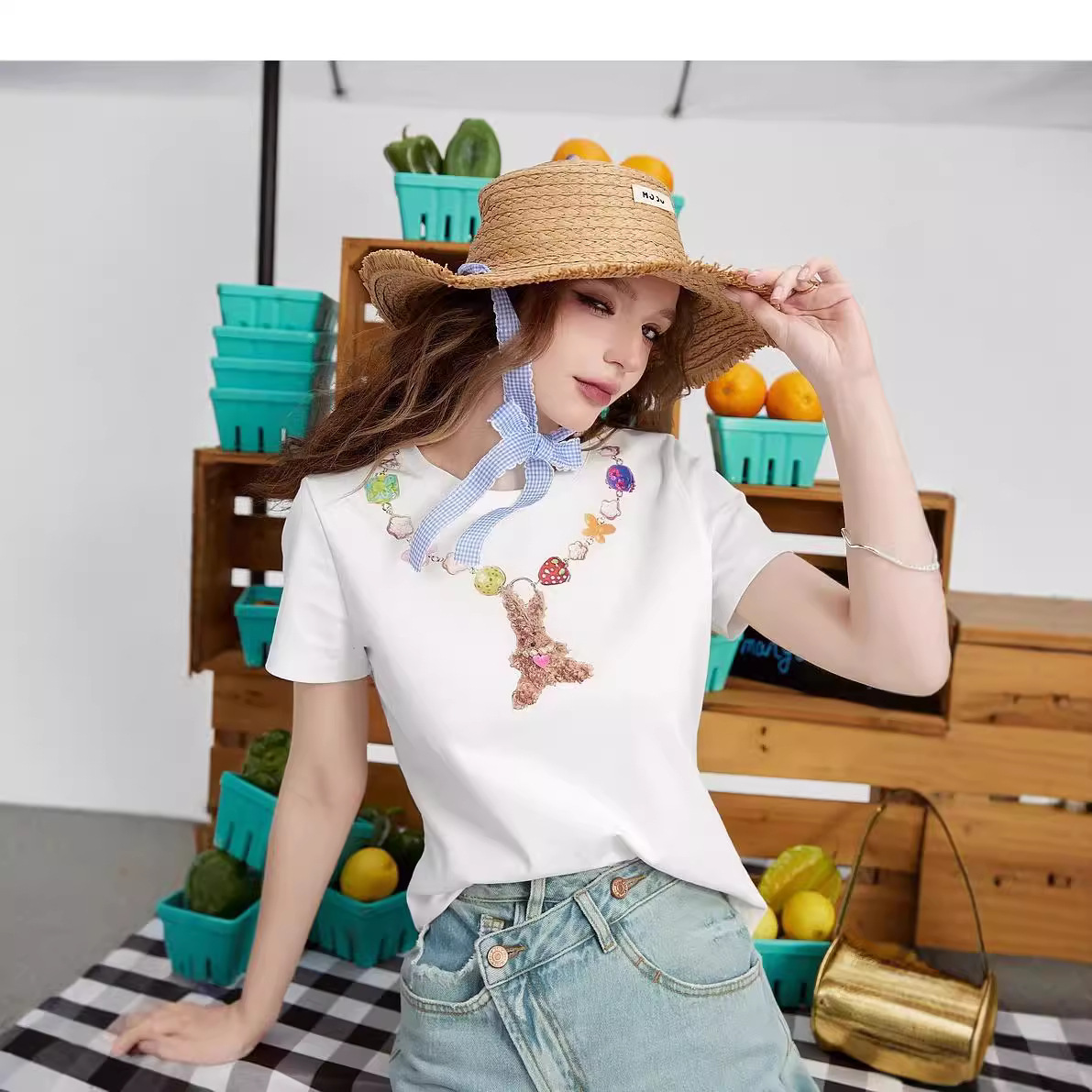 彩虹项链印花正肩t恤女夏季新款修身上衣