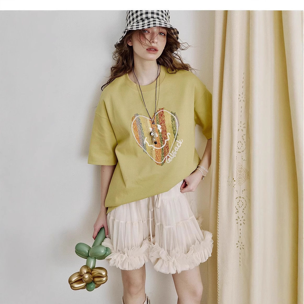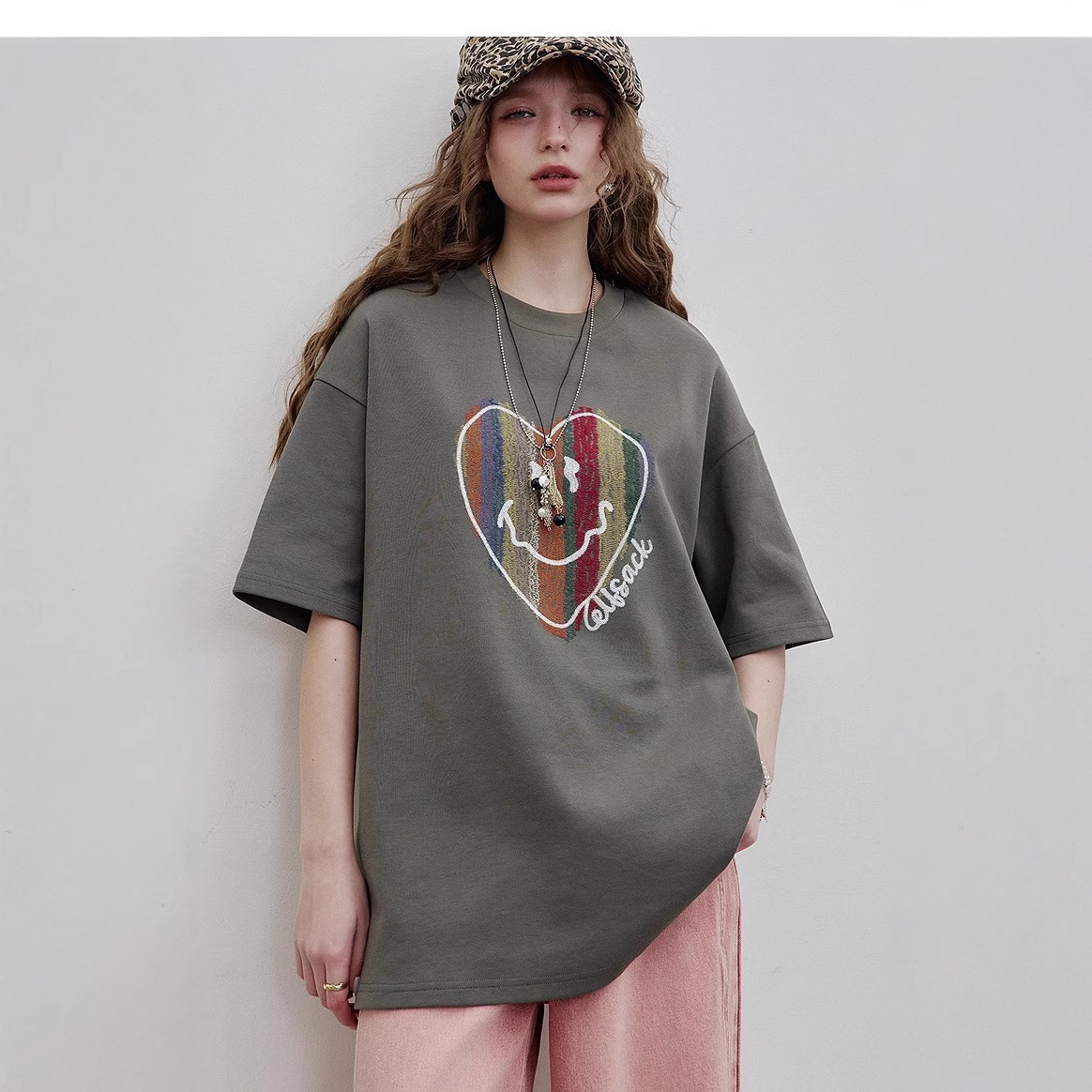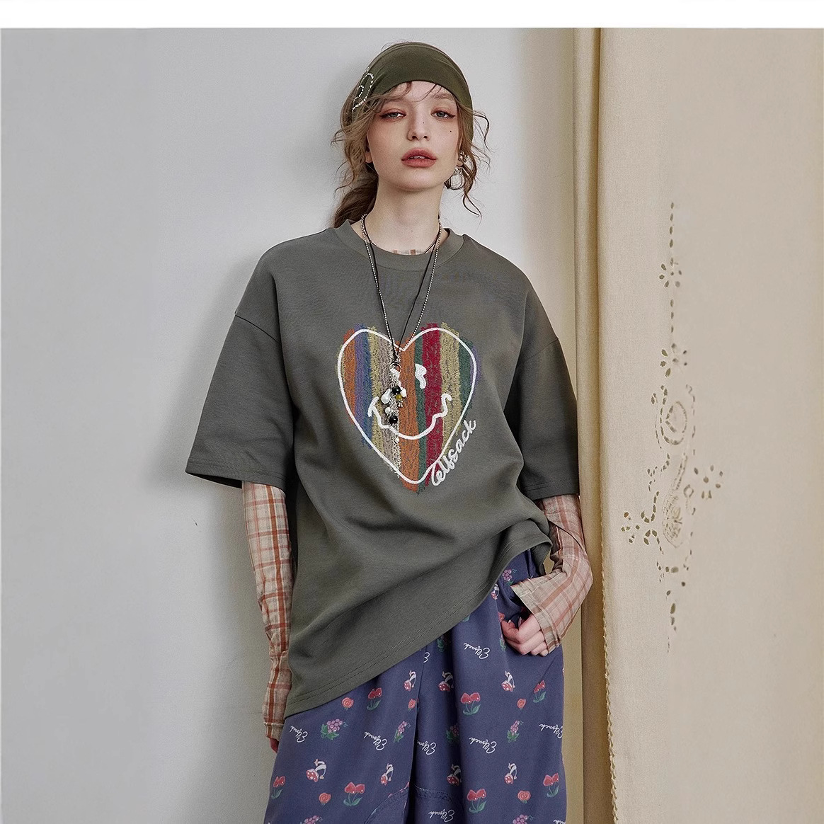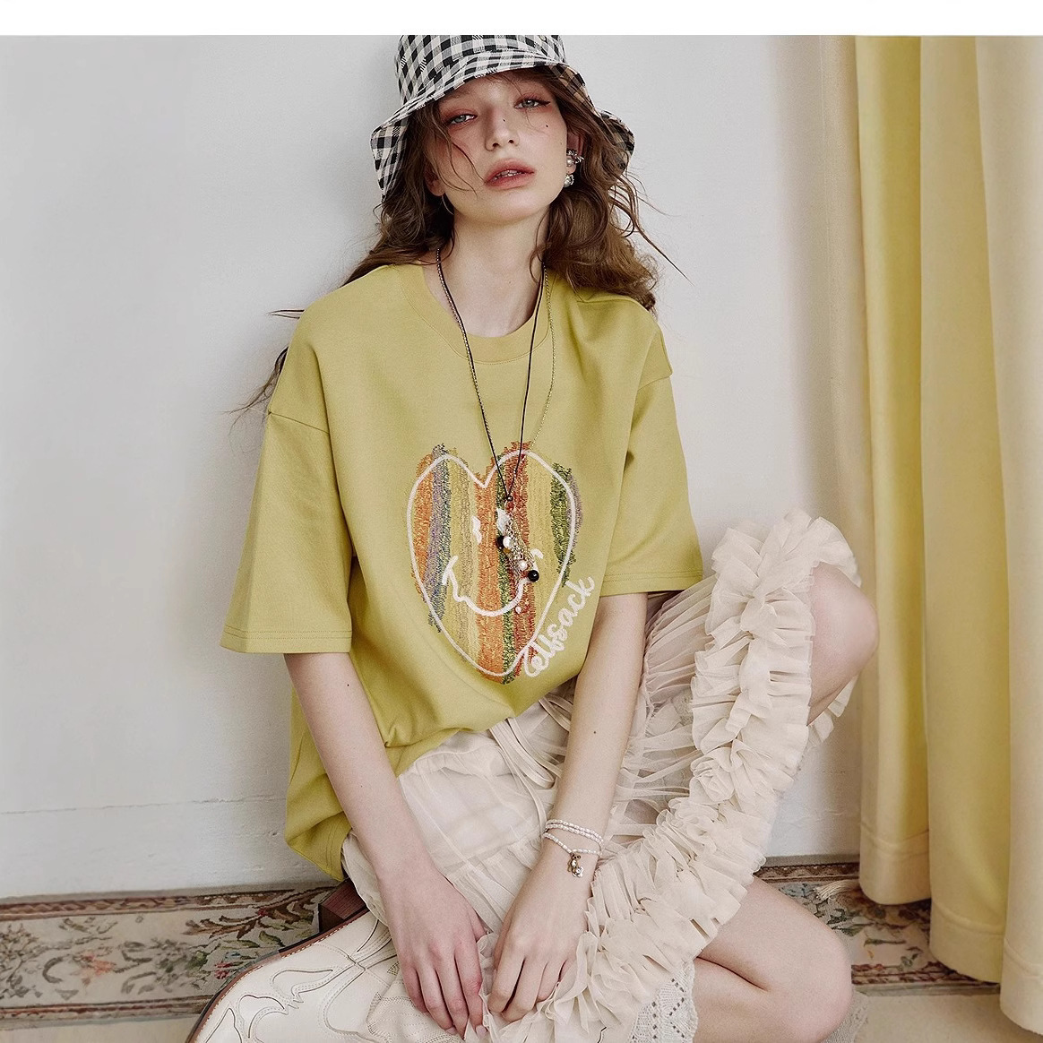 重工彩虹爱心刺绣短袖t恤女2025春新款设计感休闲上衣