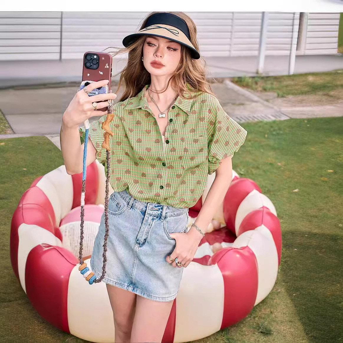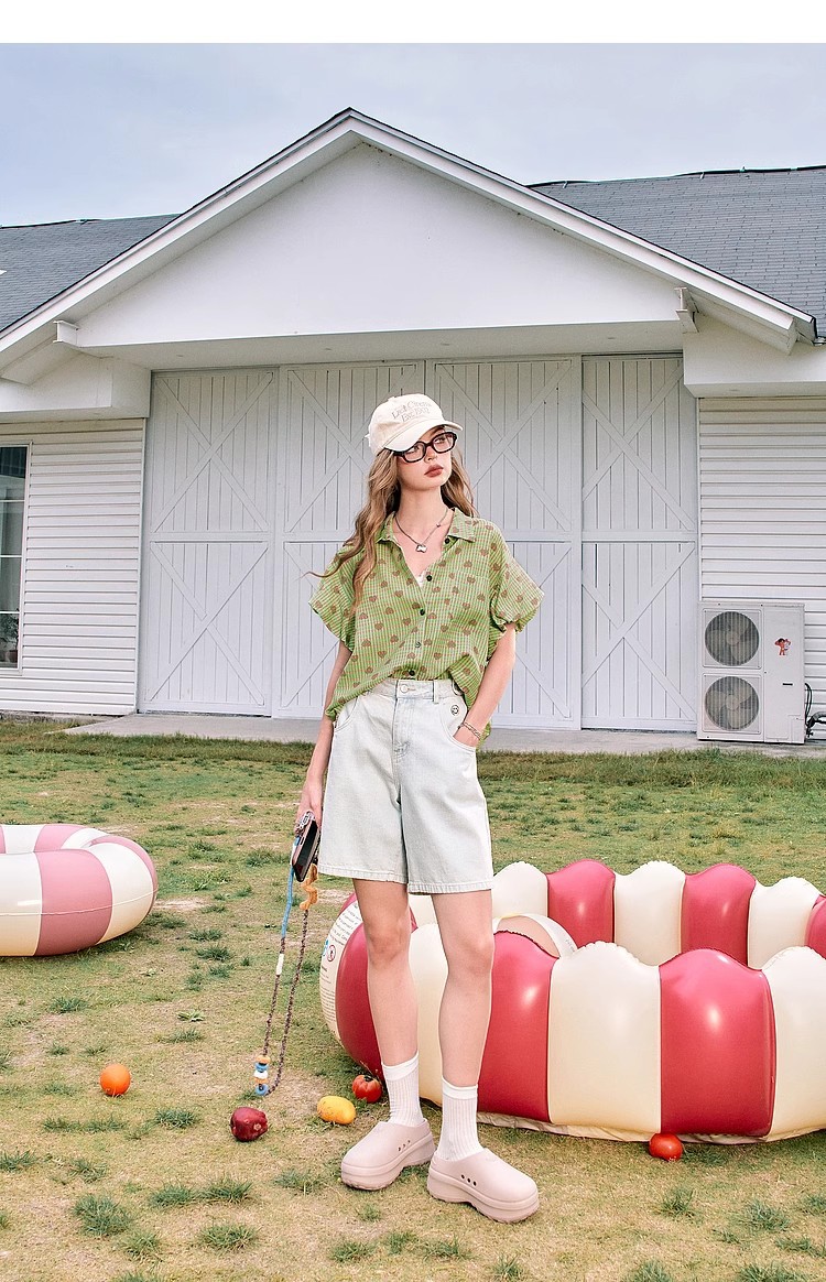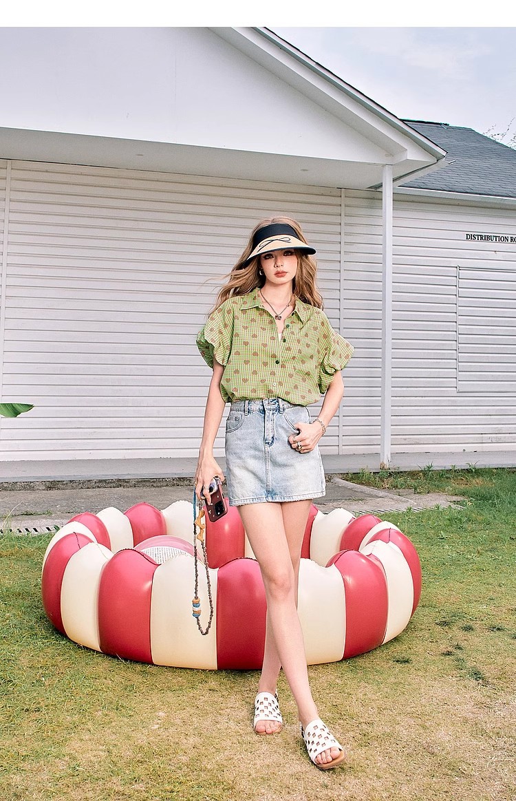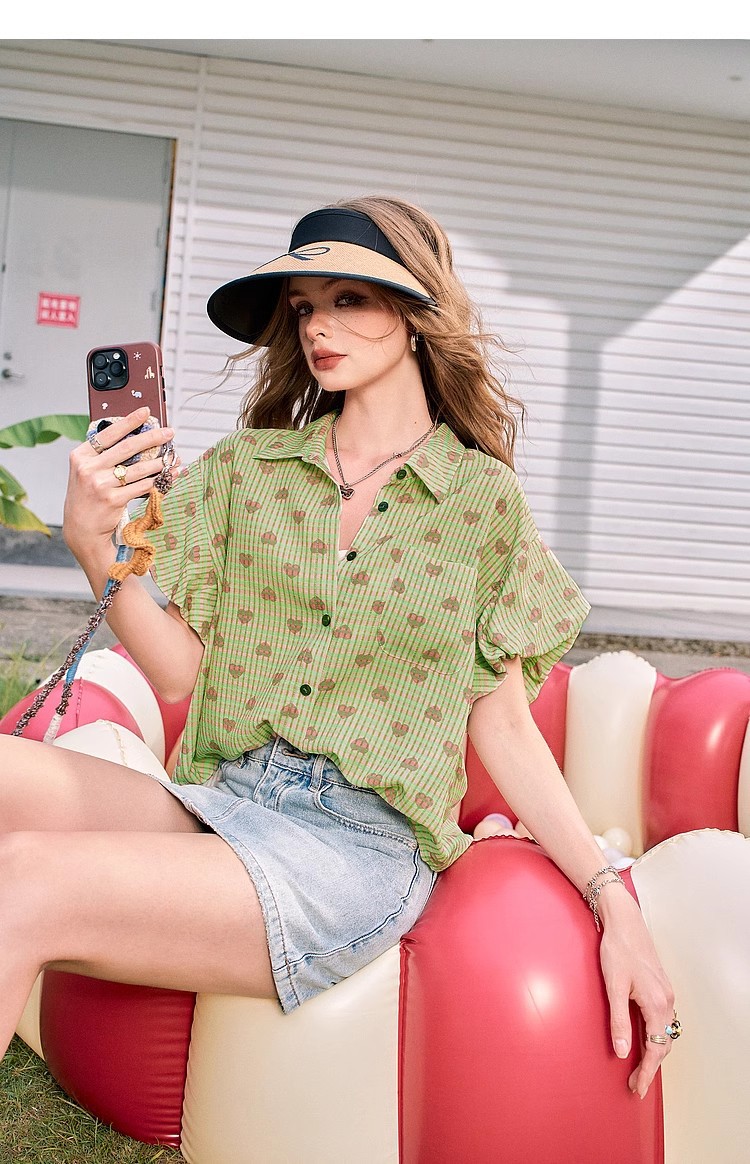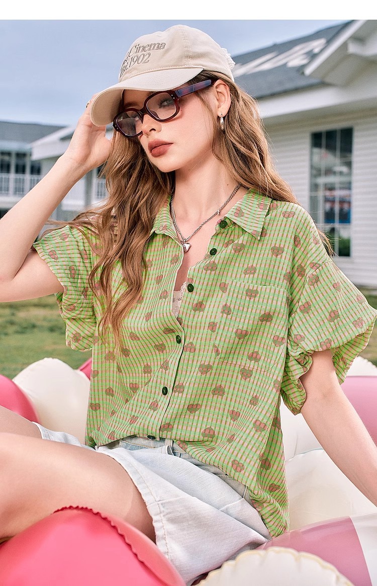 爱心印花格子短袖衬衫女夏季新款花苞袖气质小衫