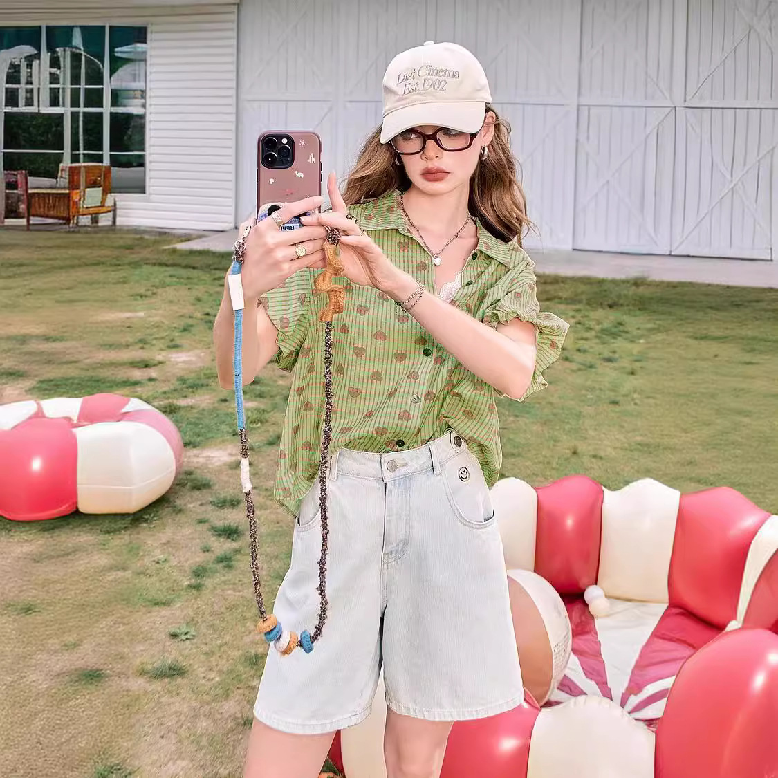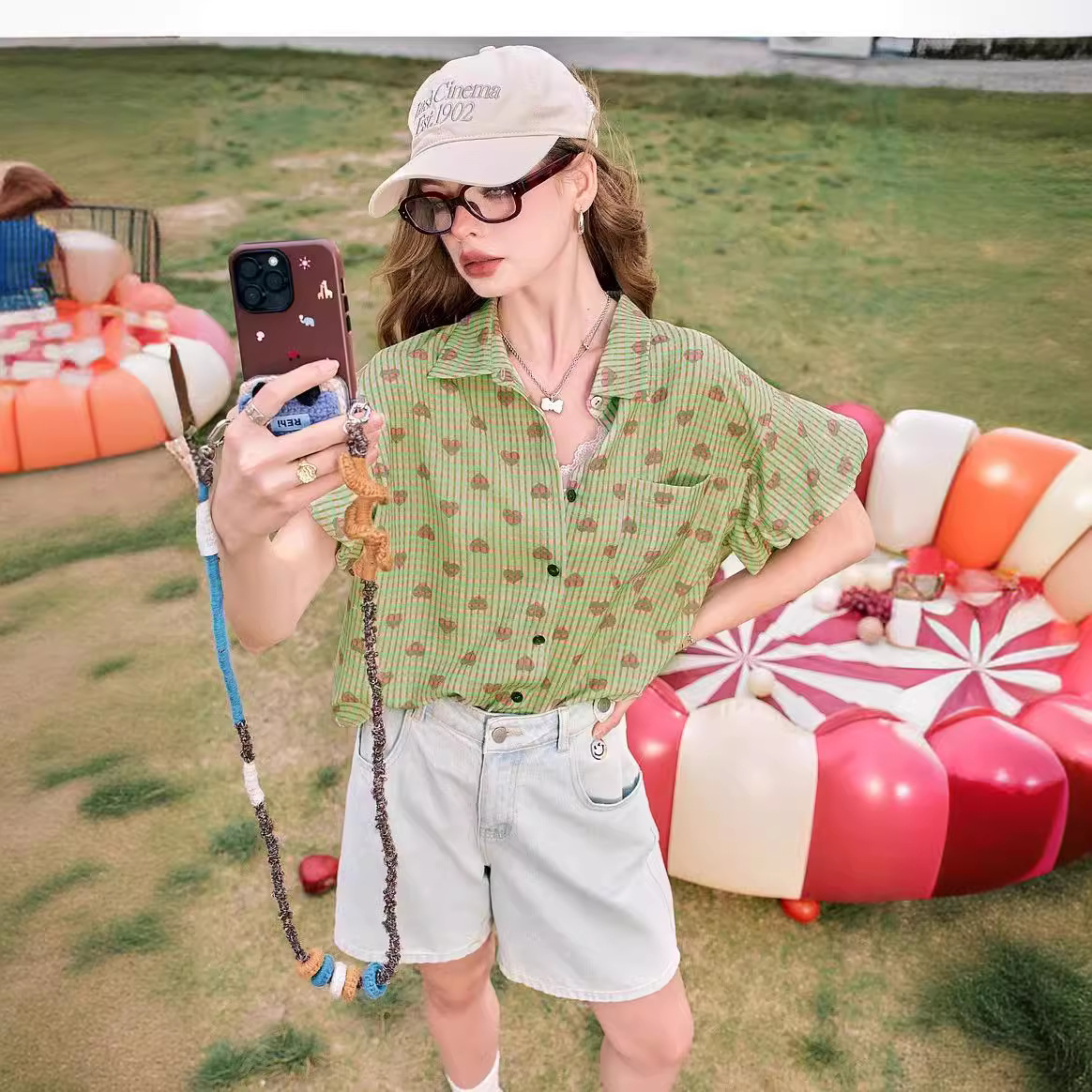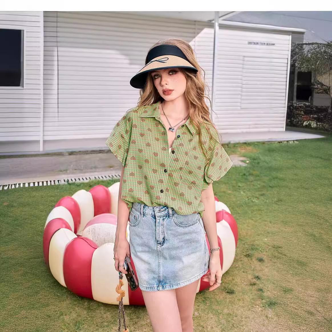 爱心印花格子短袖衬衫女夏季新款花苞袖气质小衫