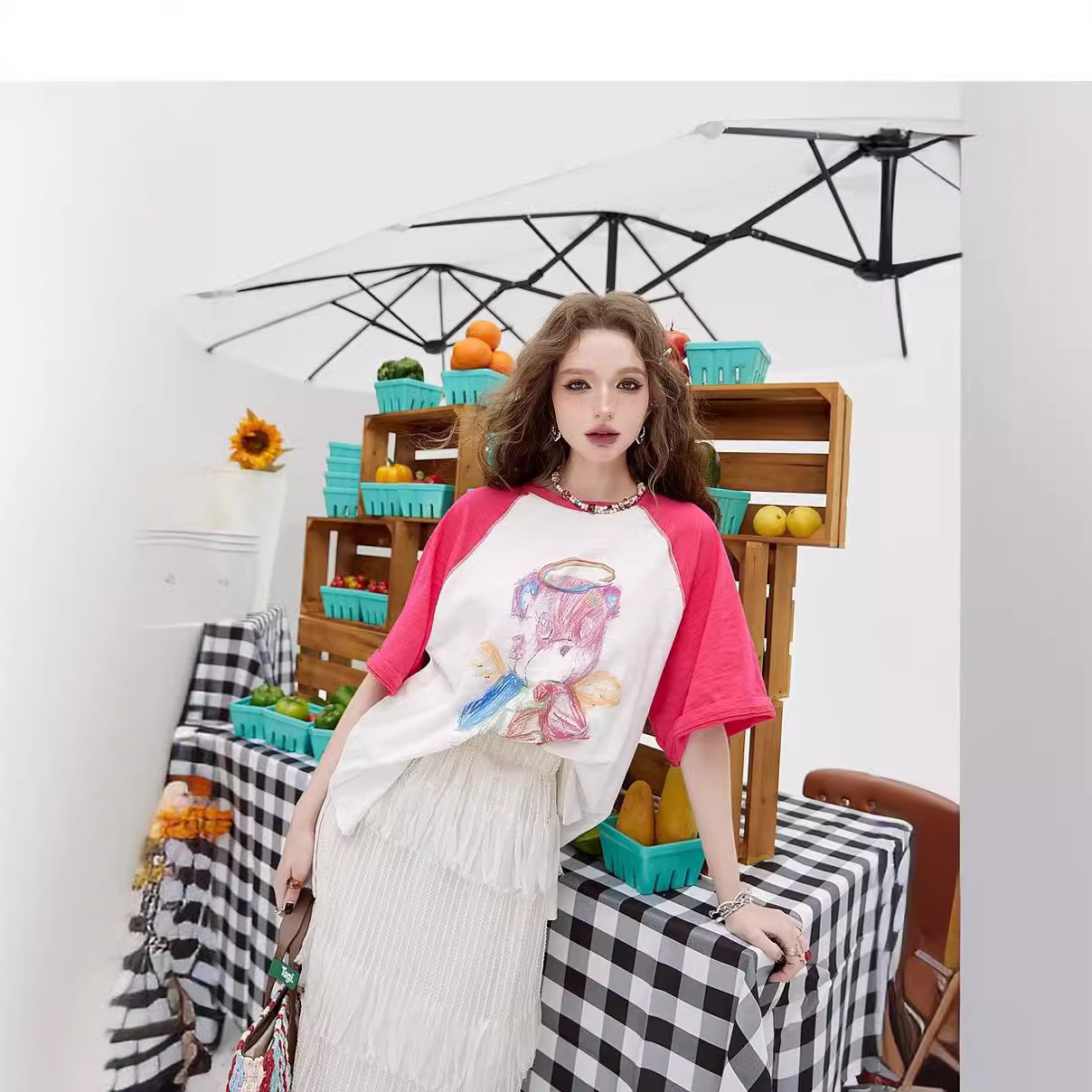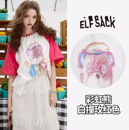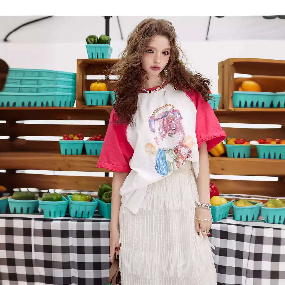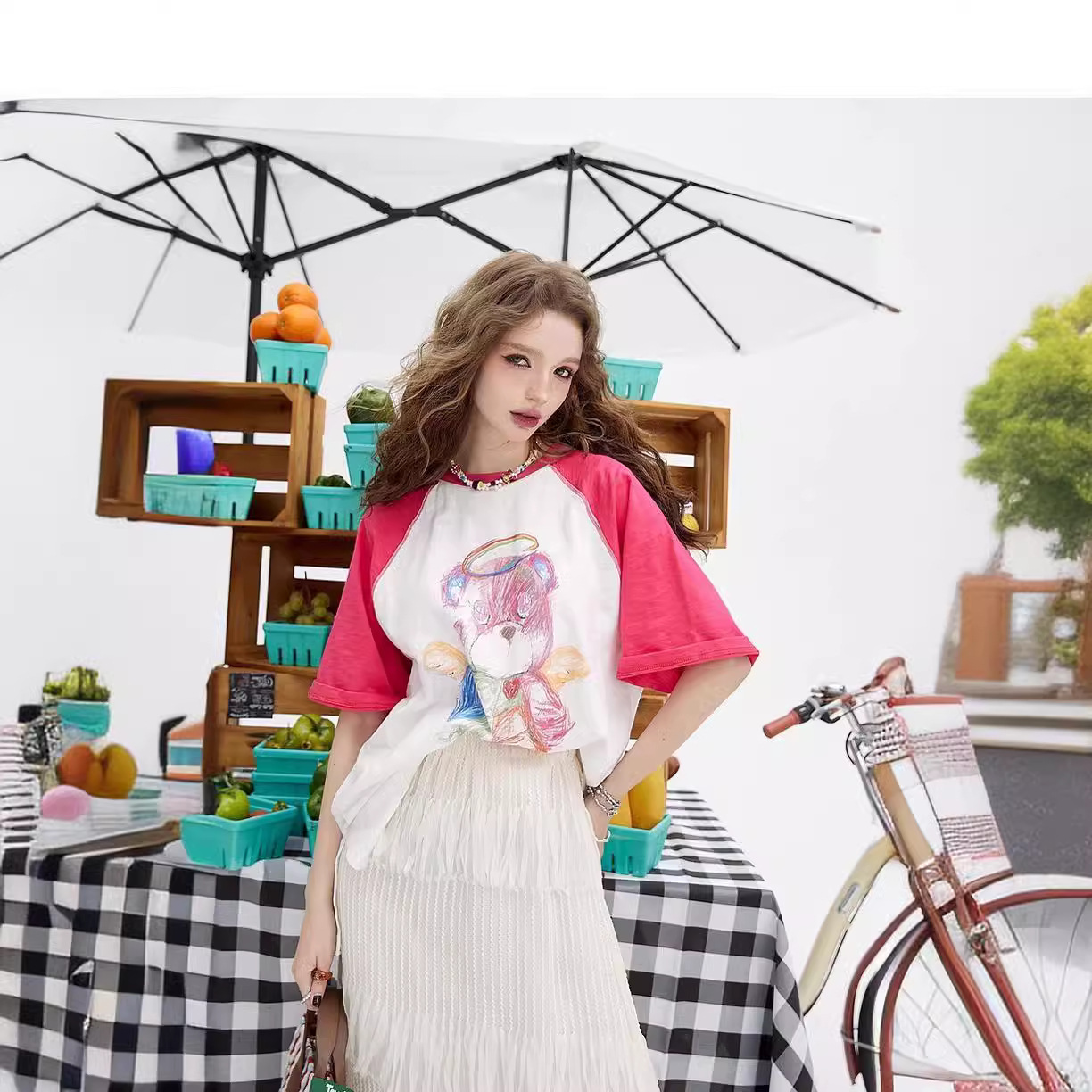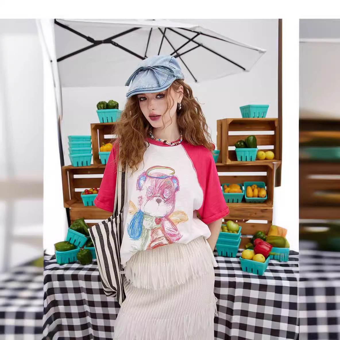 彩虹小熊印花撞色插肩t恤女春夏新款休闲短袖上衣
