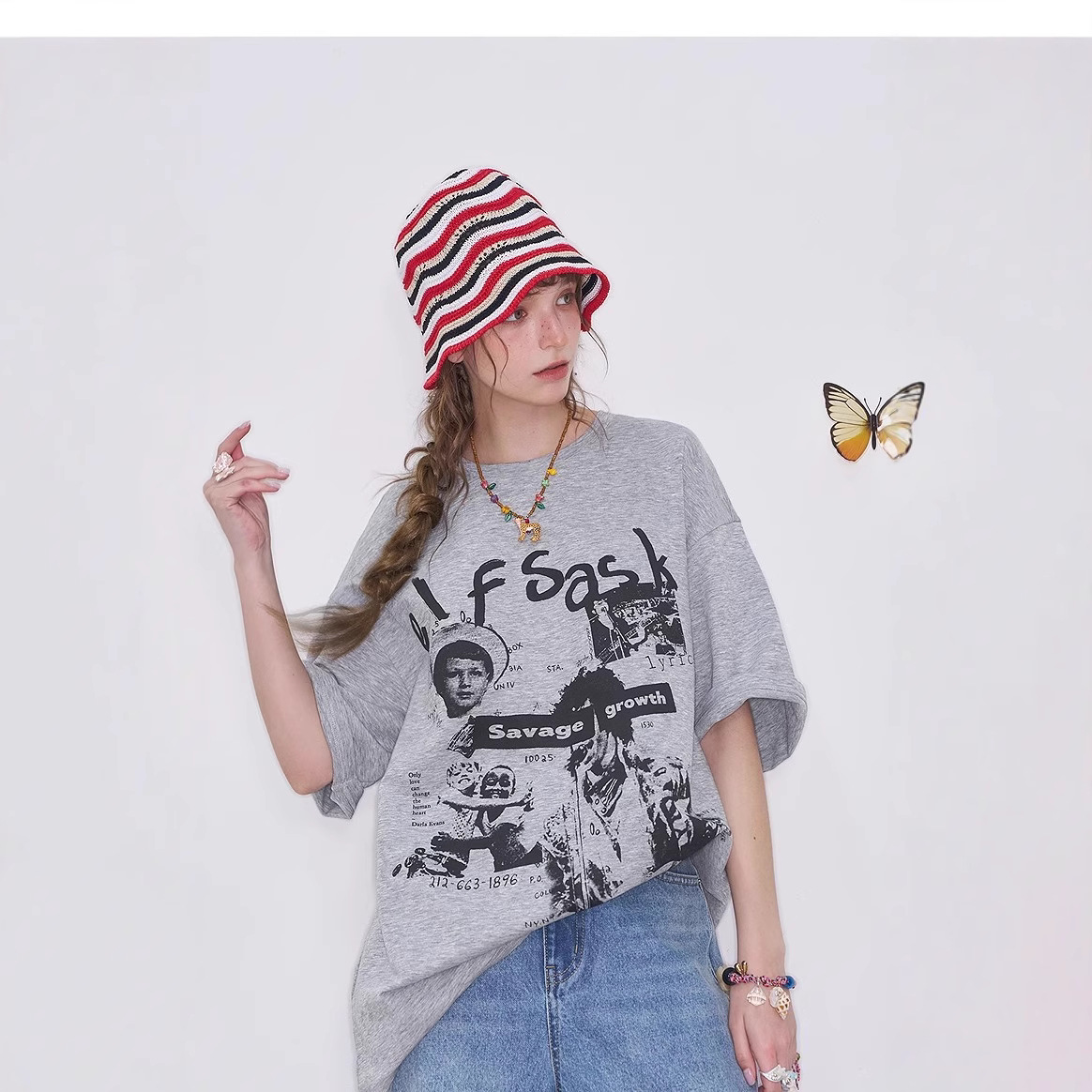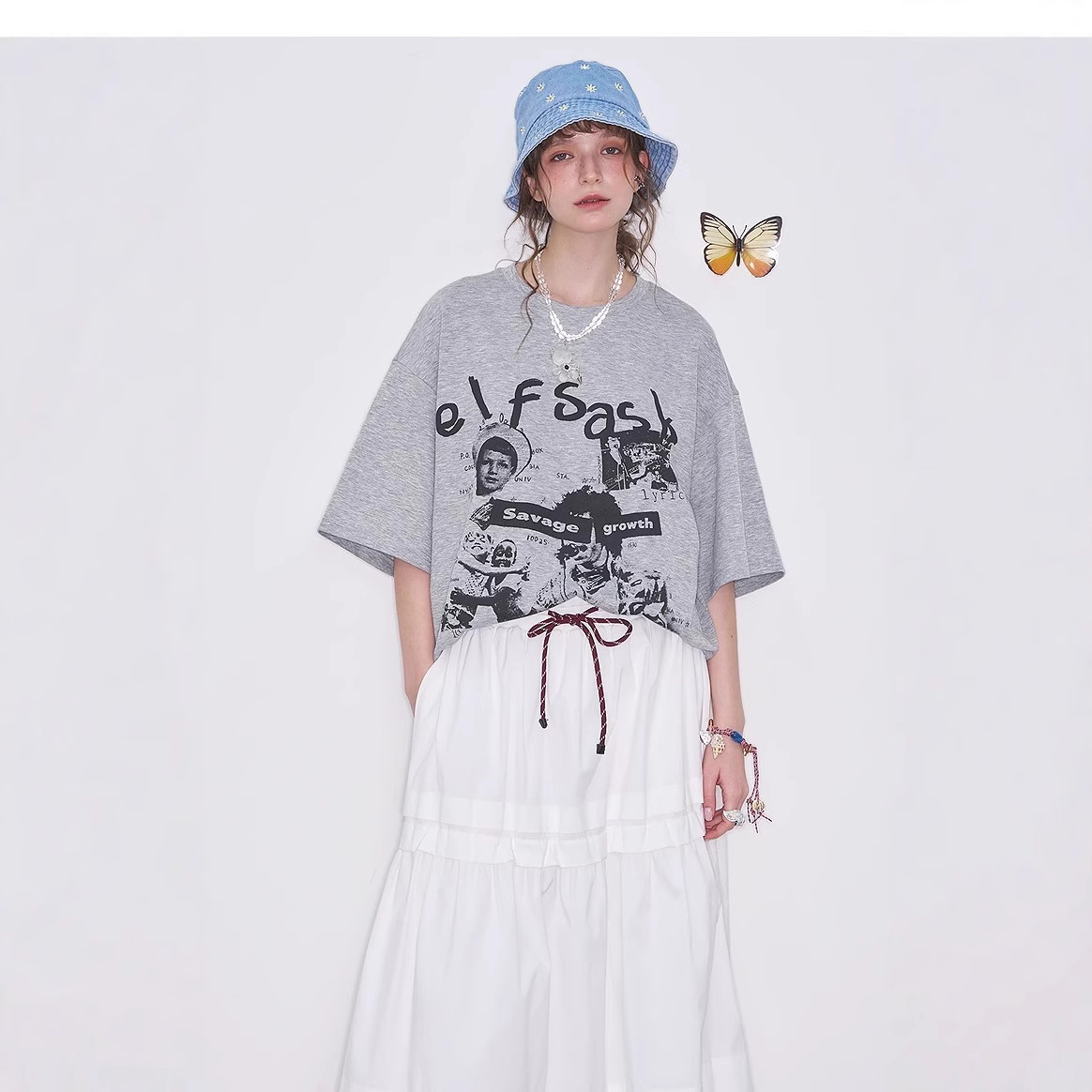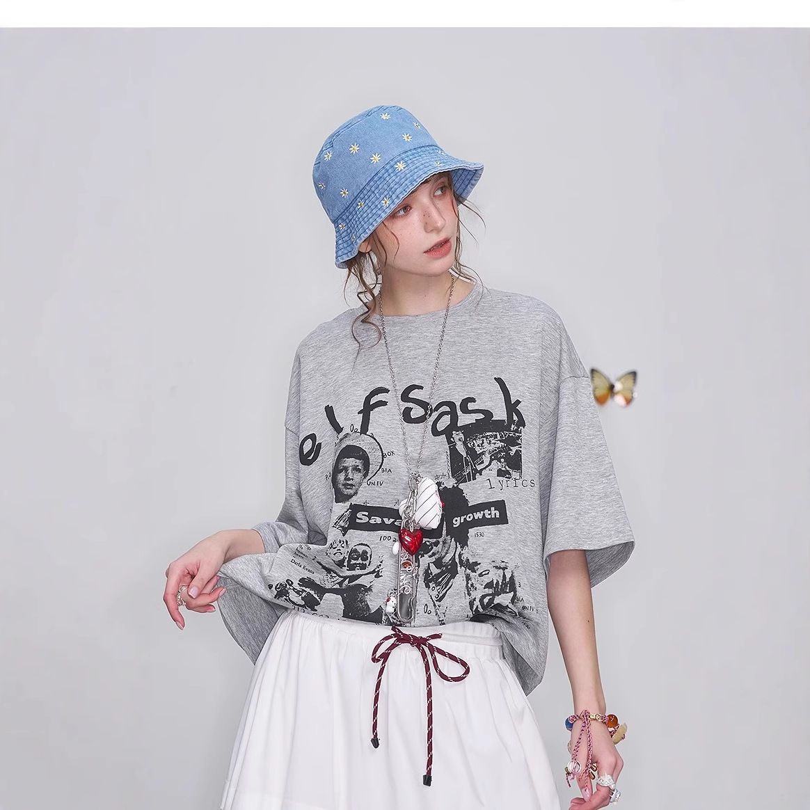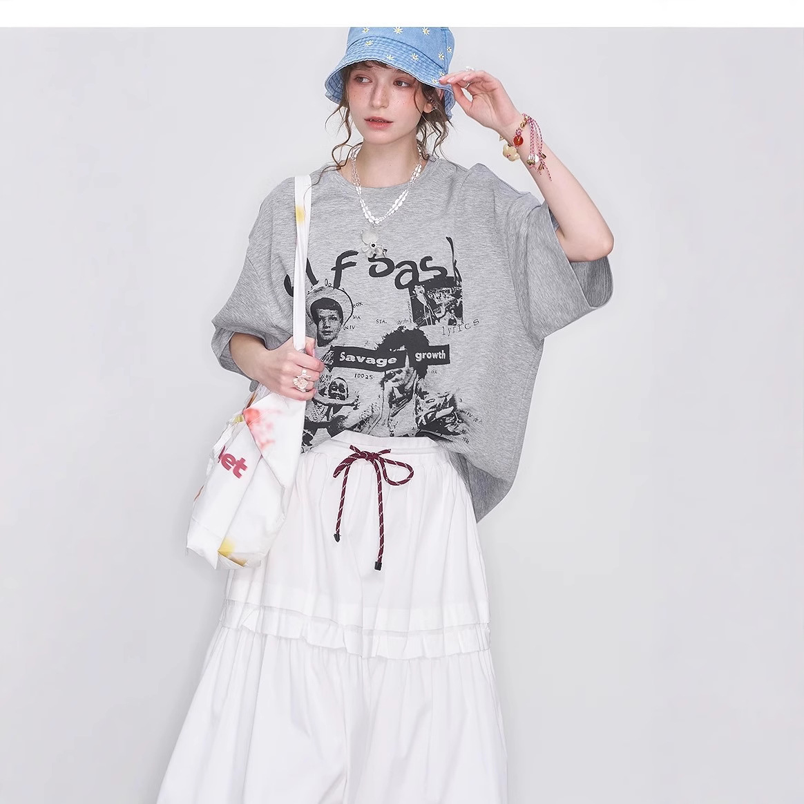 美式复古印花灰色短袖t恤女2025春季新款宽松休闲上衣