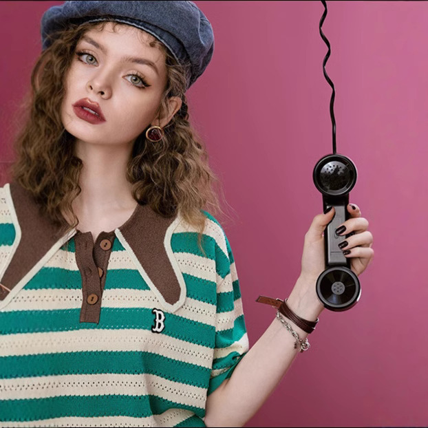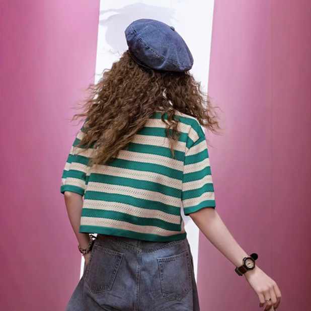 镂空条纹冰丝polo衫女夏季新款小个子辣妹短款t恤