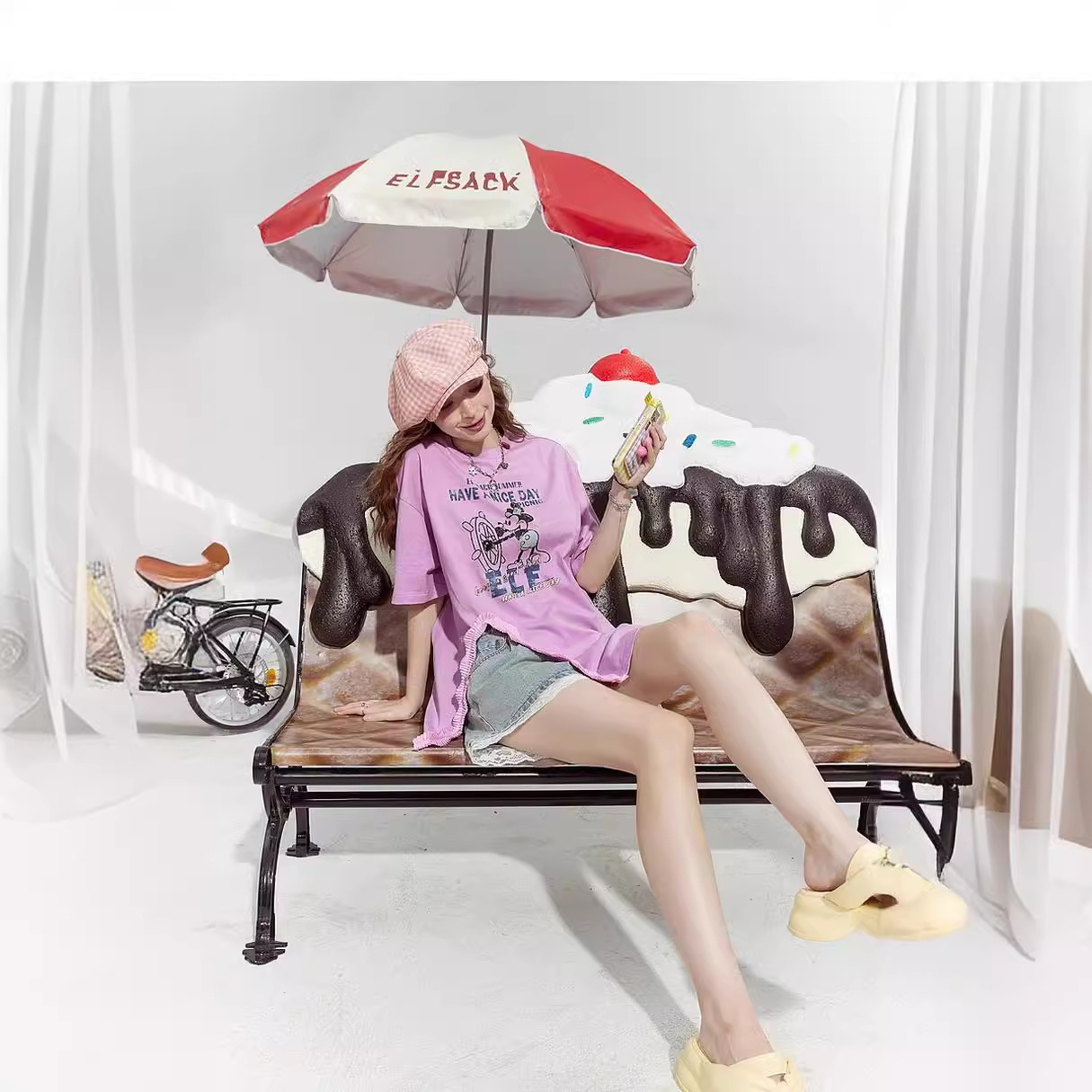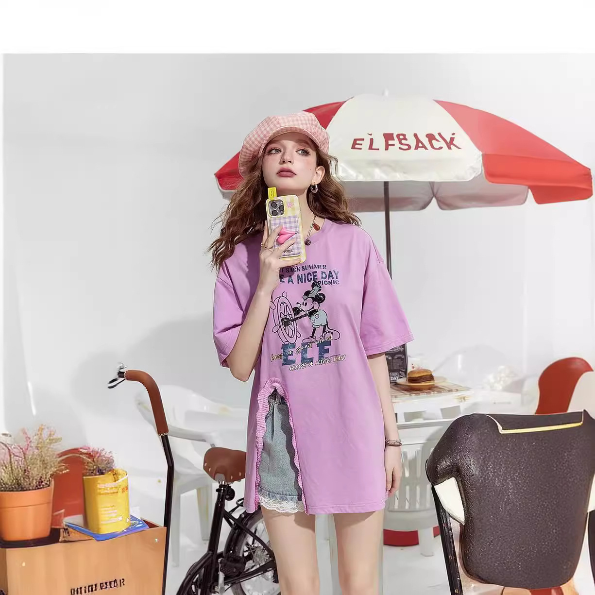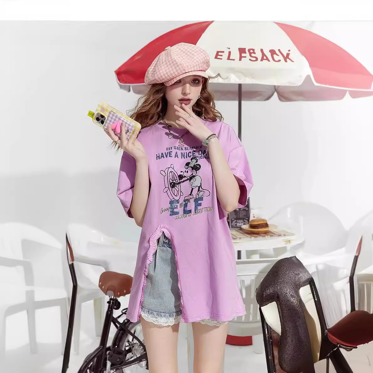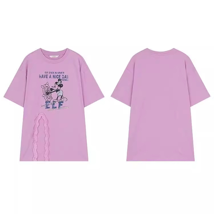 米奇印花宽松短袖t恤女夏季新款侧边开叉抽褶设计