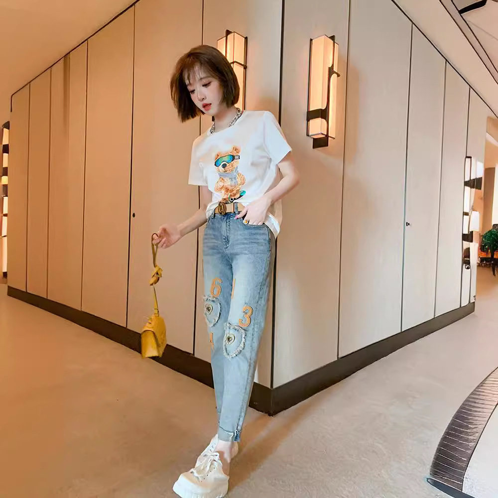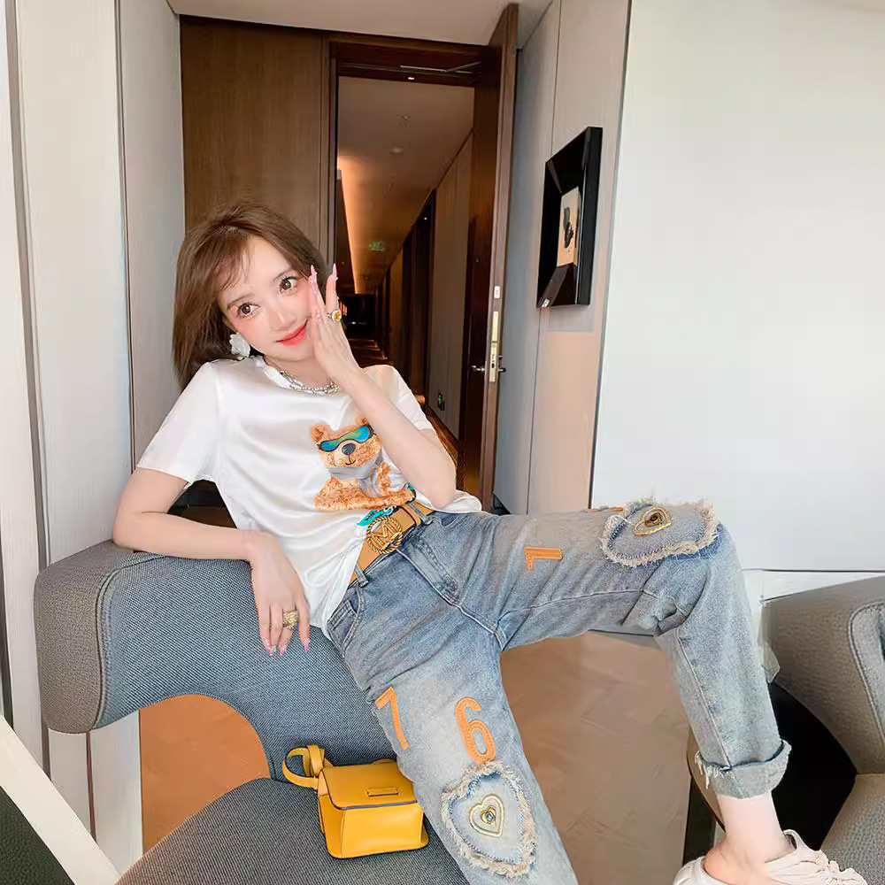 卡通小熊拼接丝光棉T恤+贴布流苏牛仔裤套装女夏季新款
