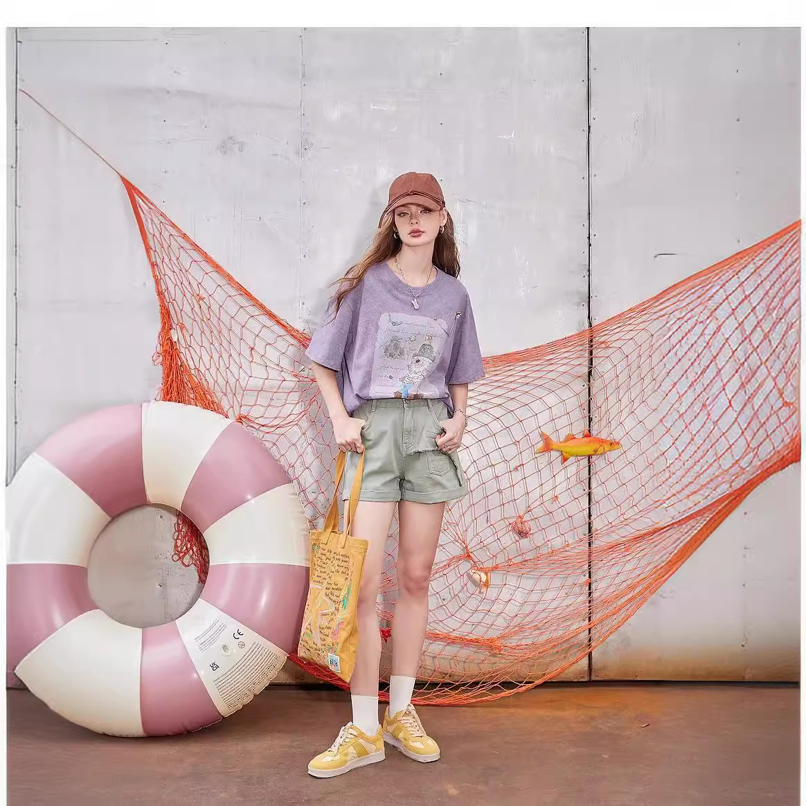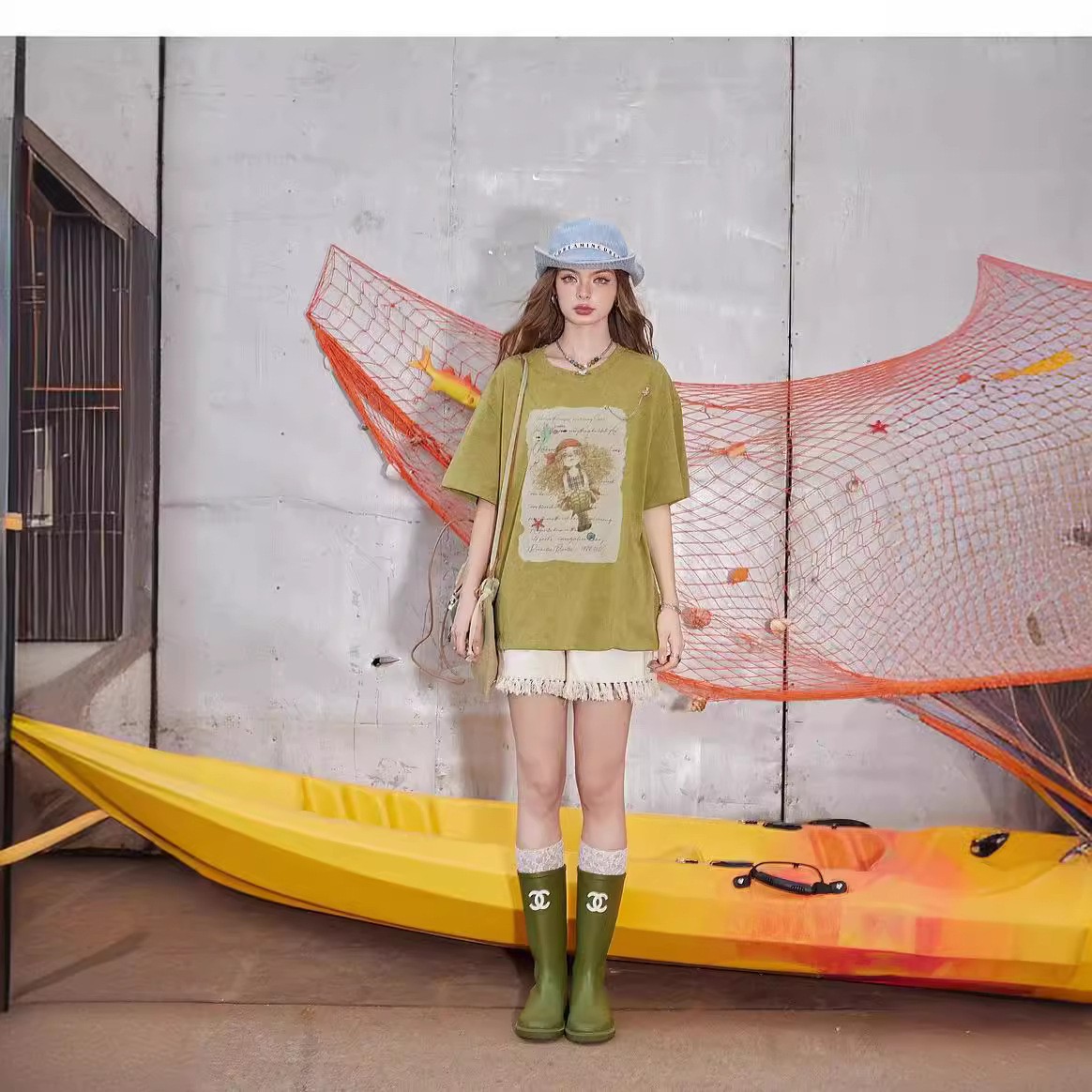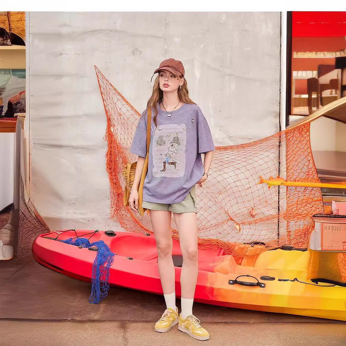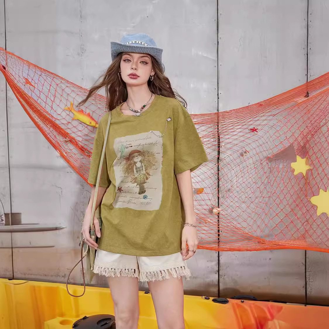 复古斑驳宽松短袖t恤女夏季新款金属链设计上衣