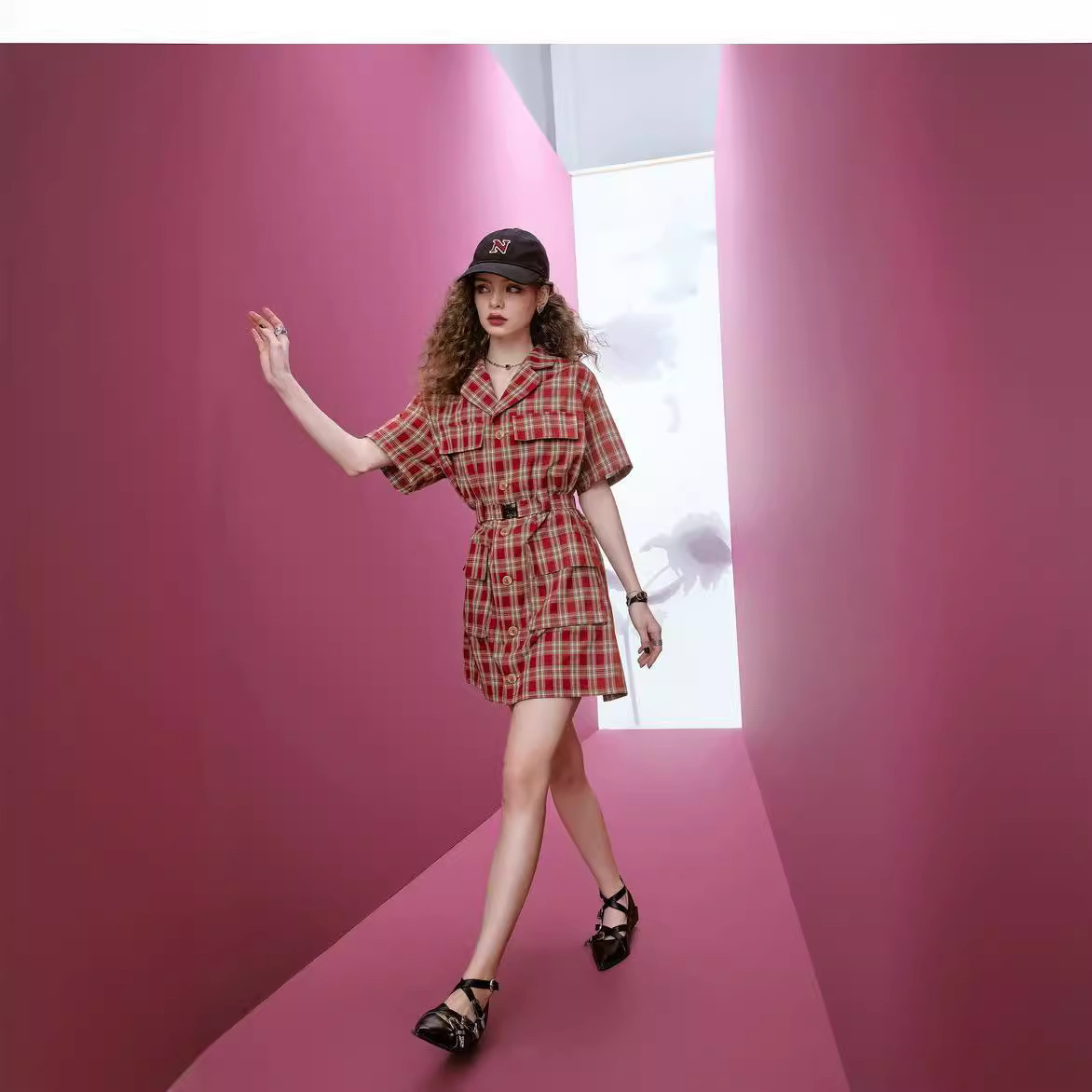 红色西装裙格子连衣裙女夏新款收腰气质显瘦学院风