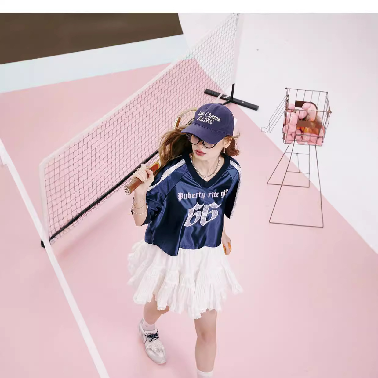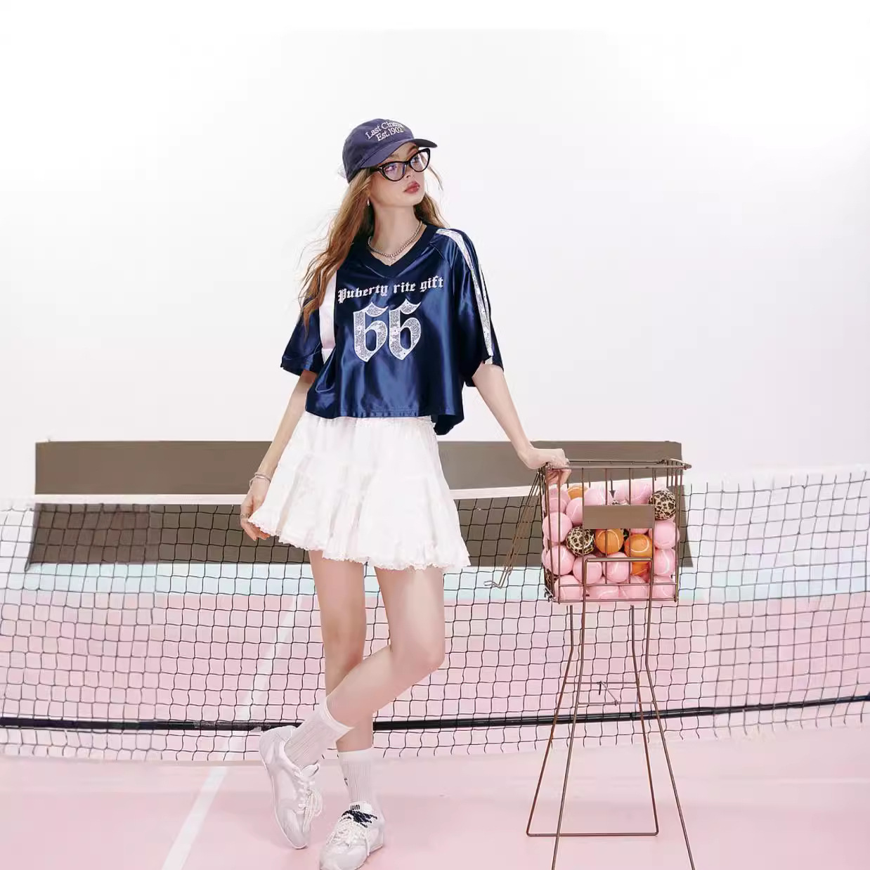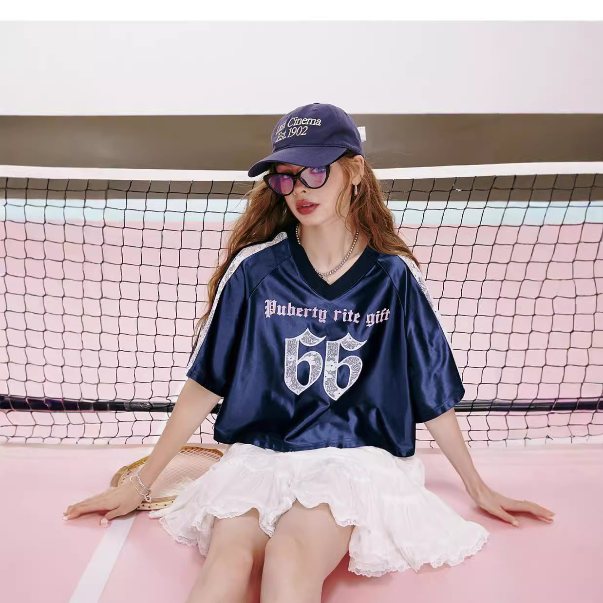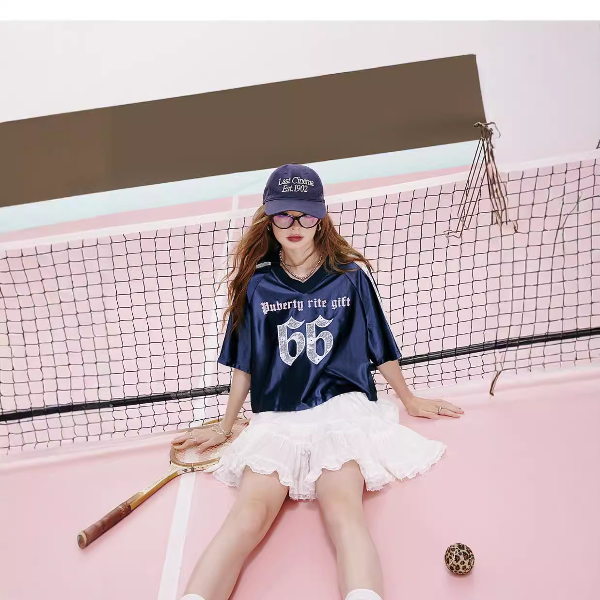 蕾丝拼接v领短袖t恤女学院风宽松显瘦上衣
