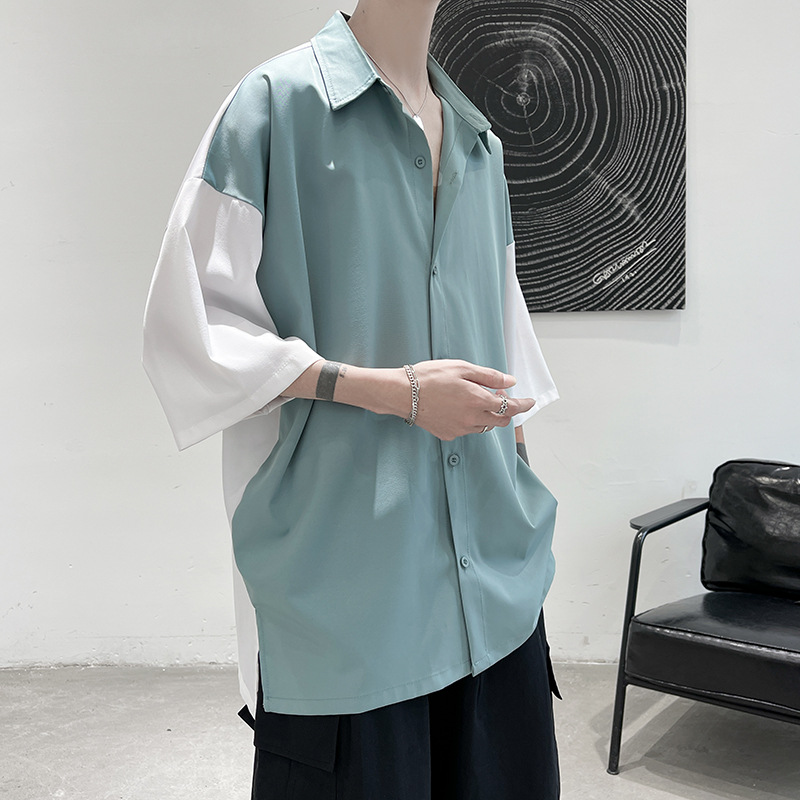 新款夏季男士短袖衬衫 时尚撞色拼接宽松大码休闲衬衣男上衣