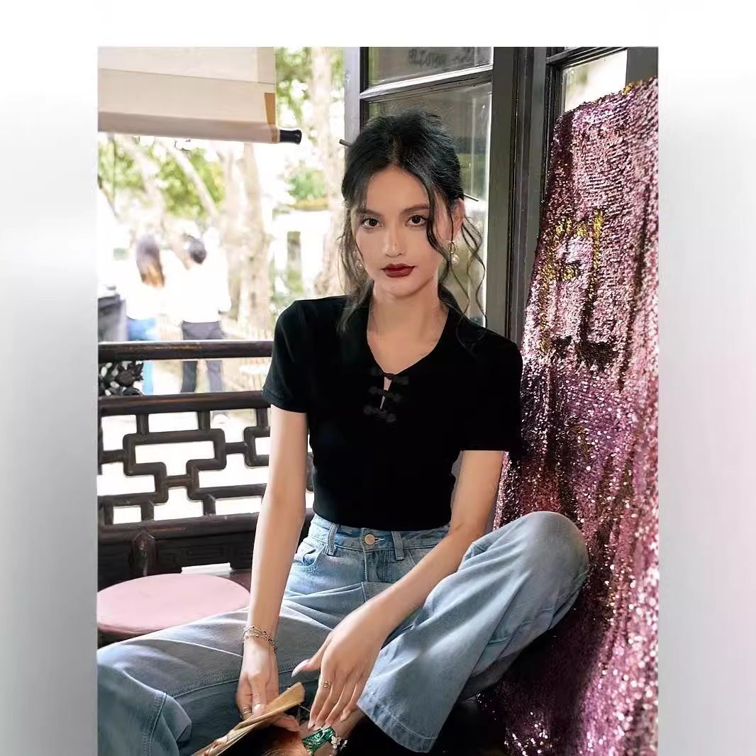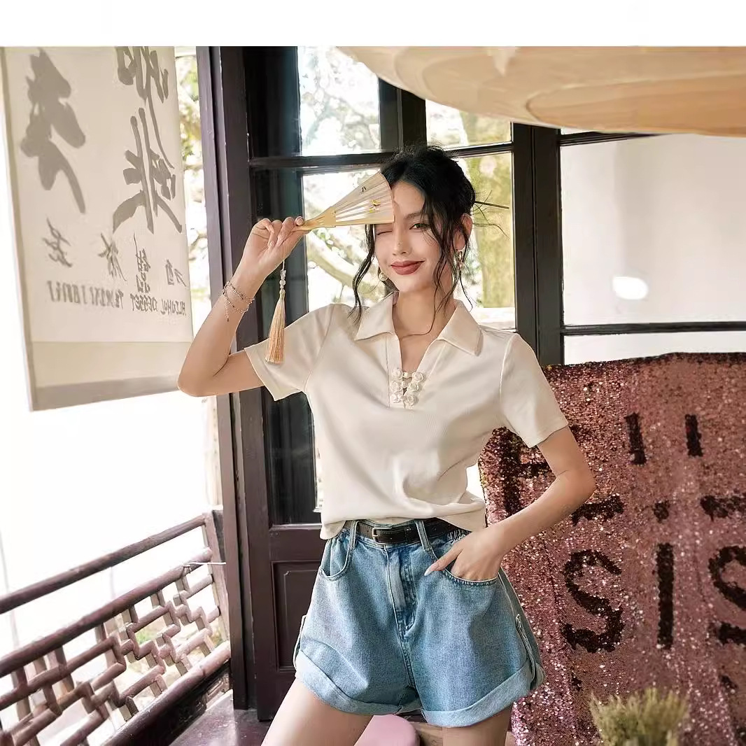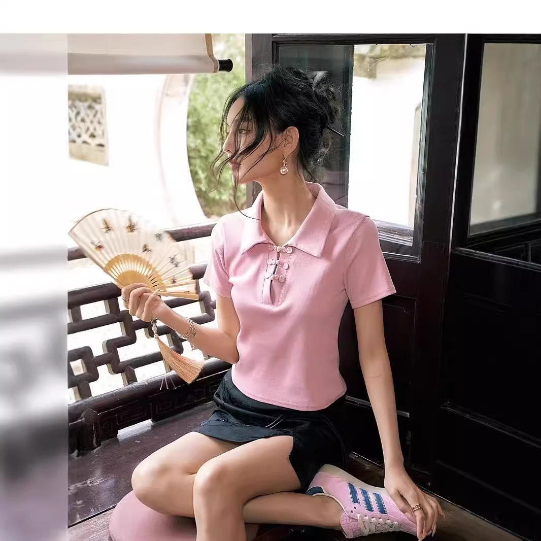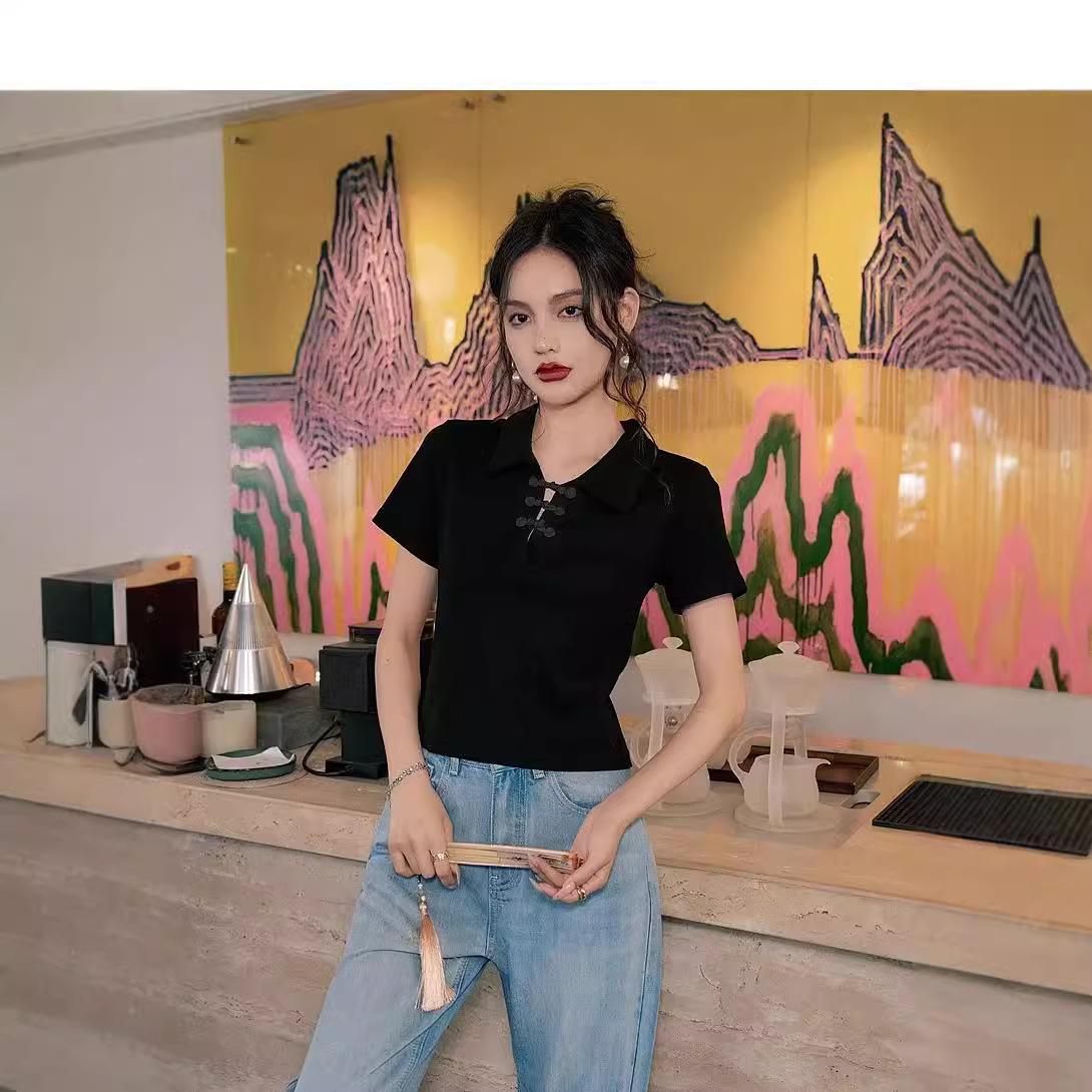 设计感polo衫短袖t恤女夏季新款修身正肩v领纯欲辣妹短款上衣