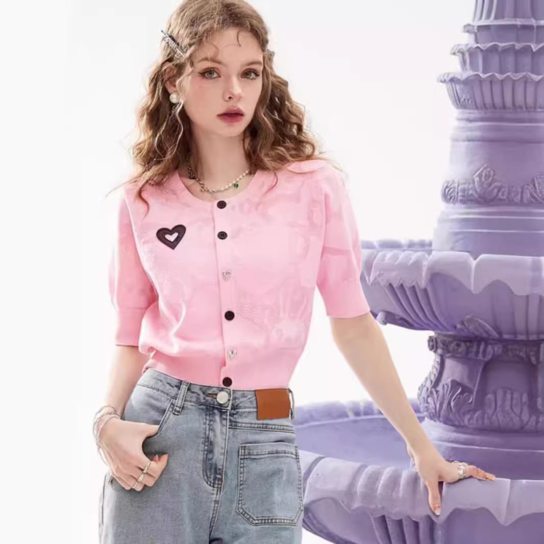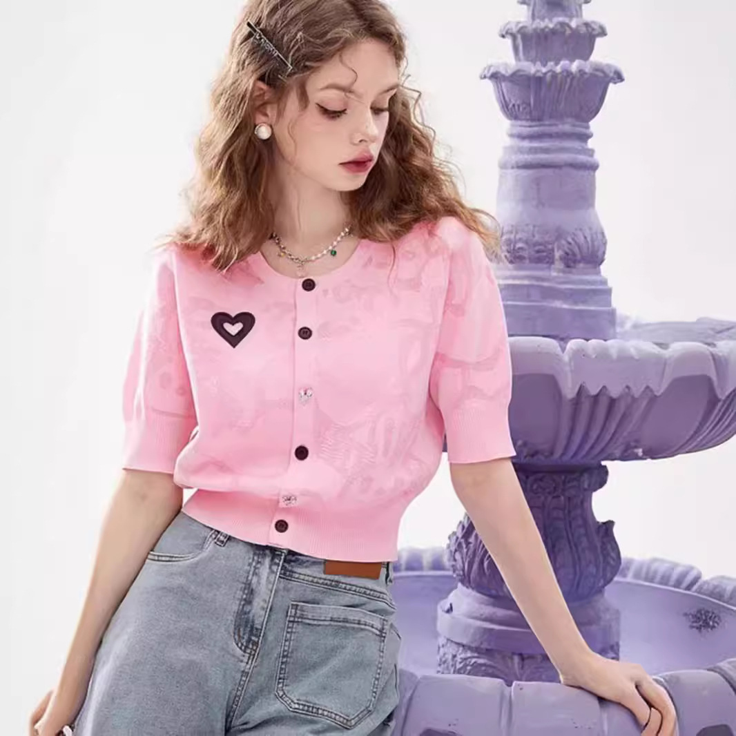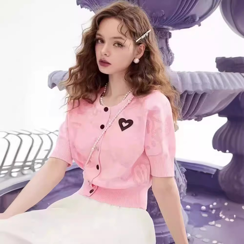 短袖冰丝针织开衫女夏设计感爱心装饰小个子外搭上衣