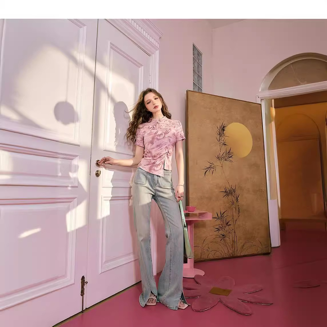 新中式国风盘扣粉色t恤女夏新款气质上衣