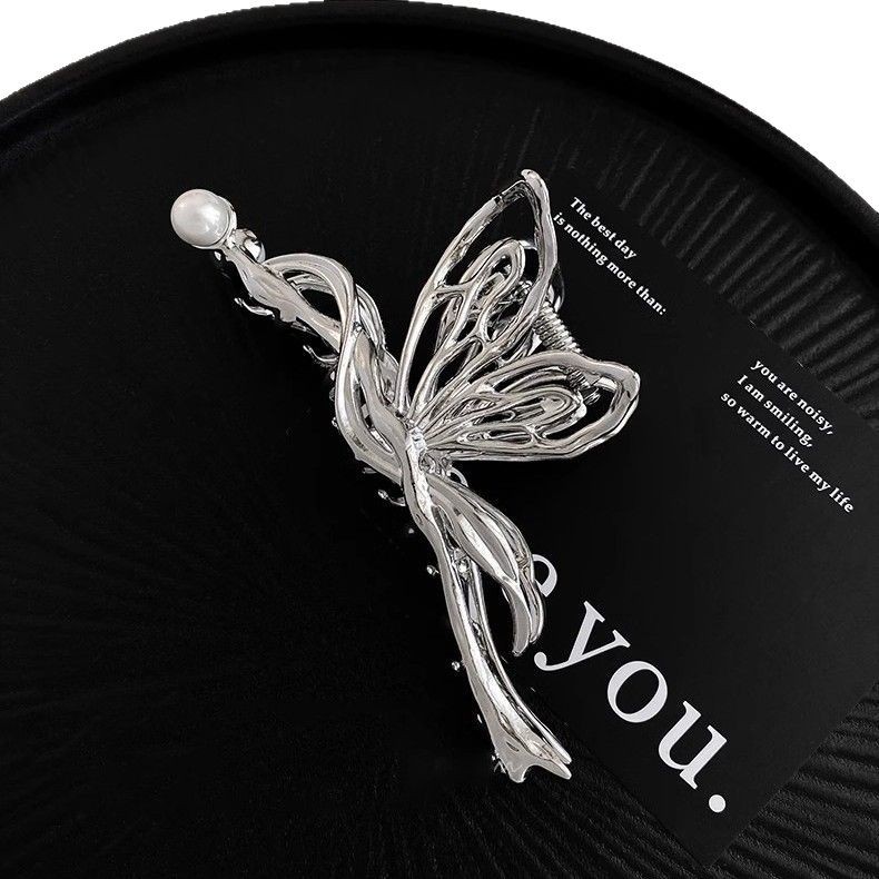冷淡风液态金属蝴蝶珍珠发夹女小众设计盘发抓夹气质高级感鲨鱼夹