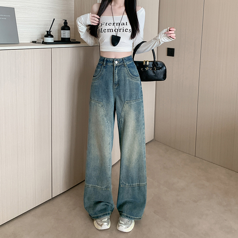 实拍实价~复古牛仔裤女2025春季新款美式水洗做旧宽松牛仔长裤子