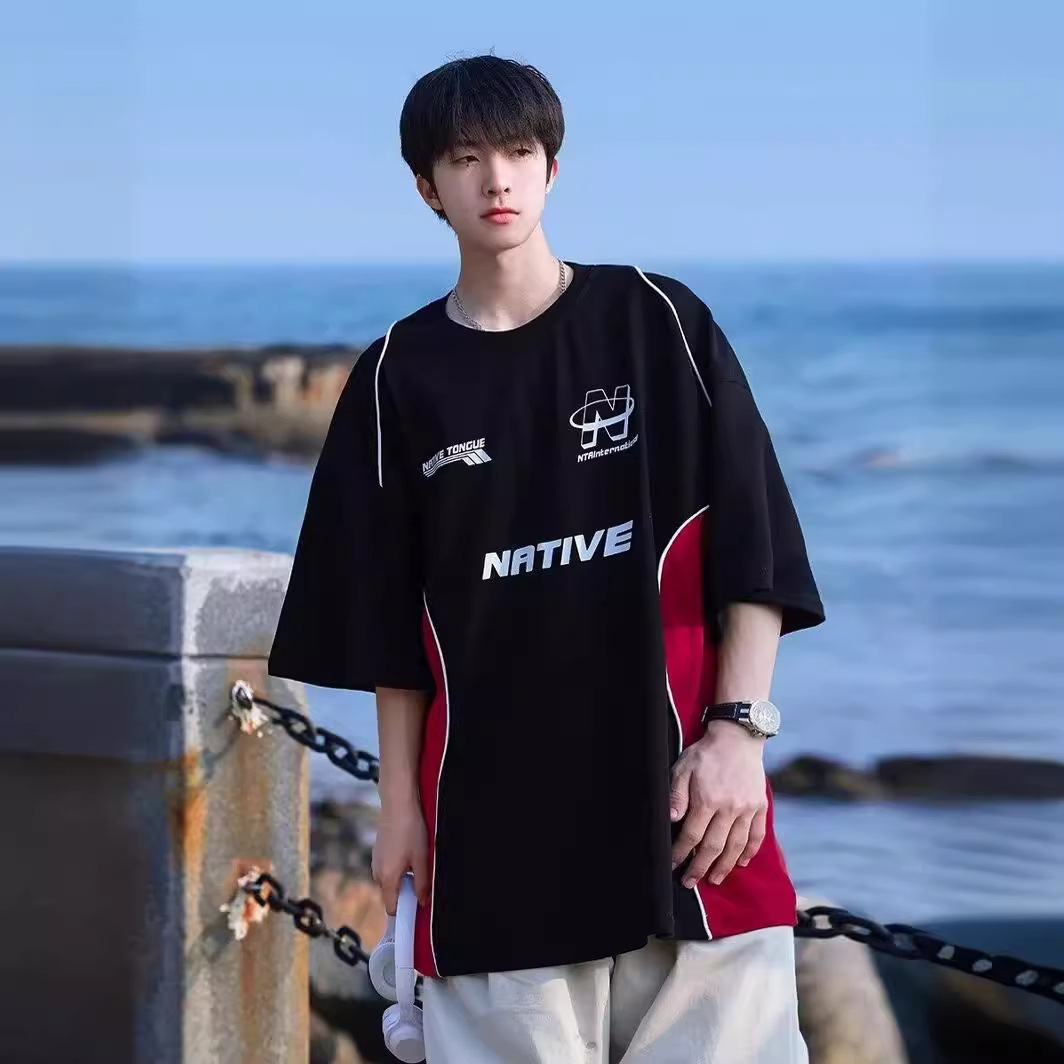 夏季ins潮男生T恤五分袖百搭外贸跨境青春流行潮牌风圆领半袖上衣