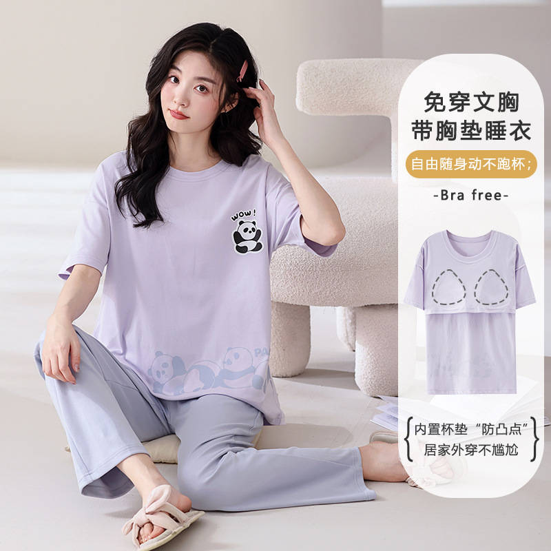 带胸垫一体睡衣女士夏季纯棉短袖休闲可外穿家居服夏天新款