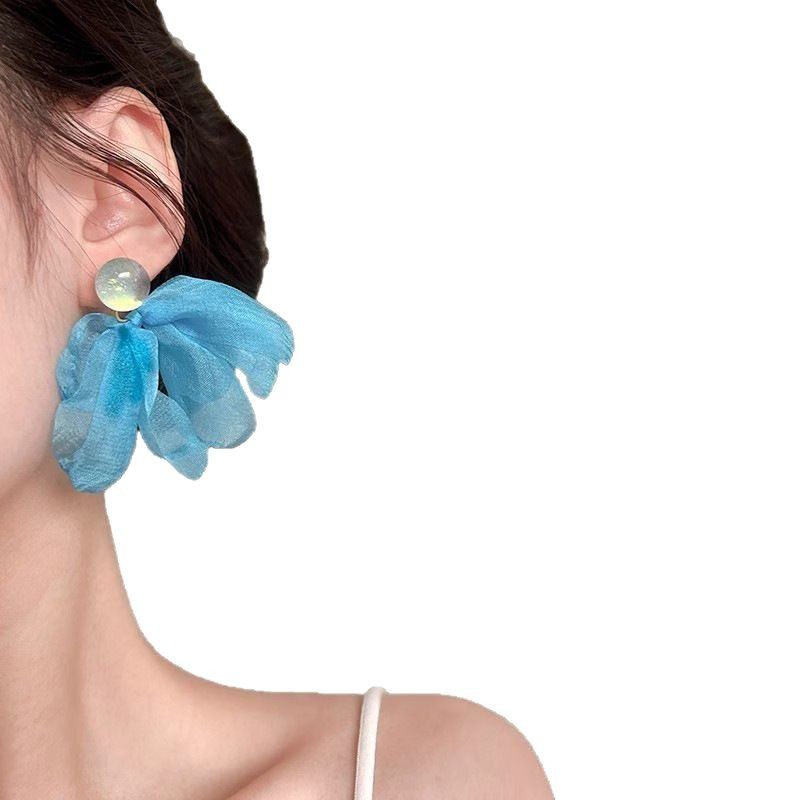 海边超仙氛围感蓝色雪纺耳钉小众设计高级耳环温柔气质度假风耳饰