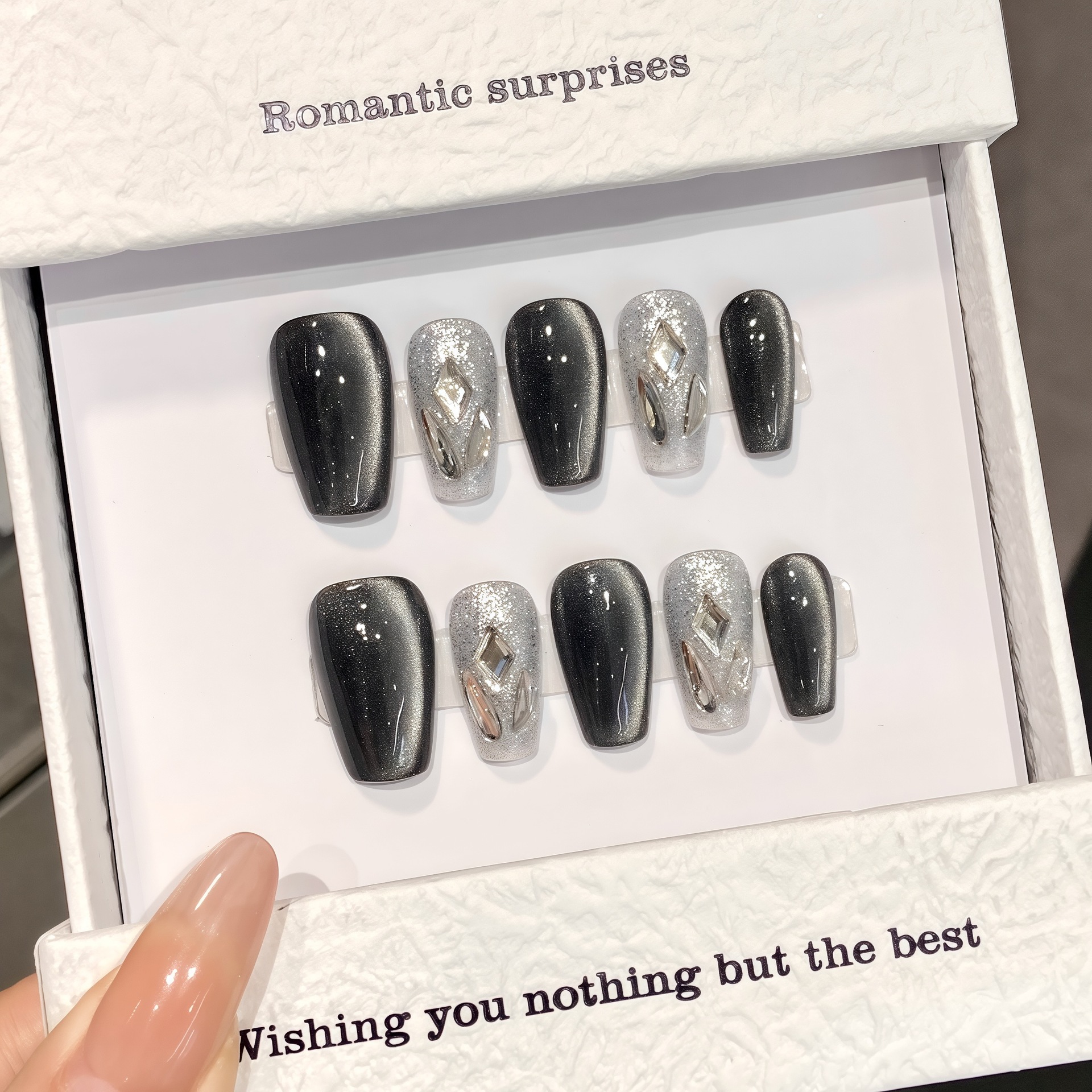 艺禾美甲 黑骑士手工穿戴甲轻奢秋冬显白气质猫眼爆闪钻可拆卸