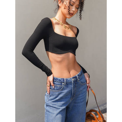 性感外贸前后双层露脐高腰U领短款长袖T恤上衣打底欧美街头小众潮