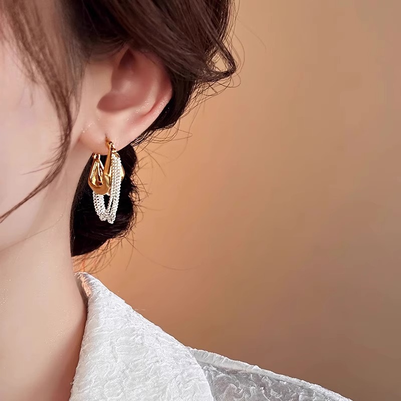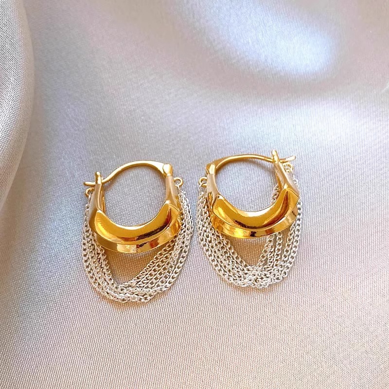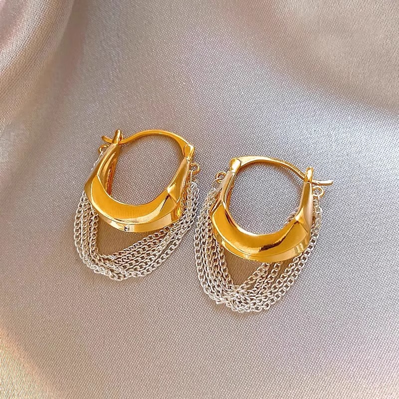 耳环女时尚金银撞色链条流苏耳环气质耳扣小众设计复古高级感耳饰