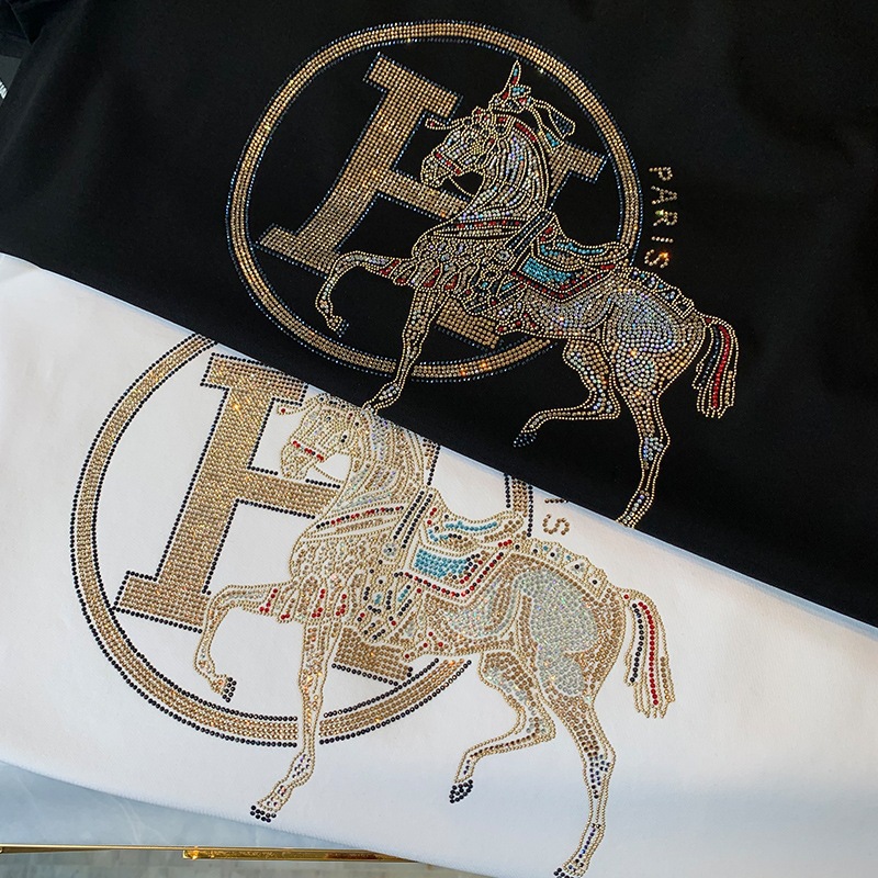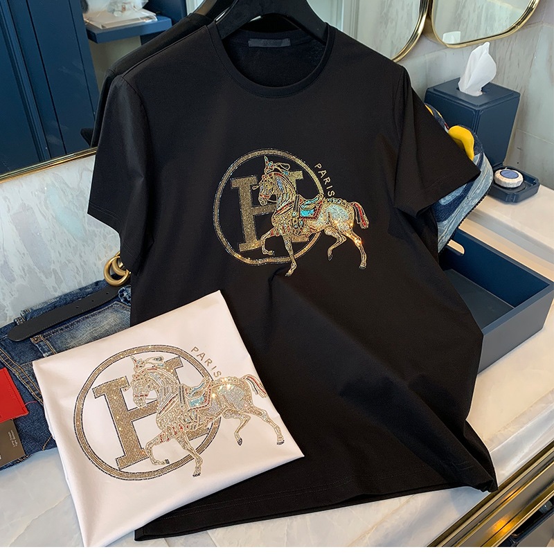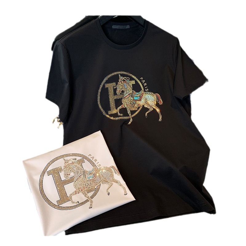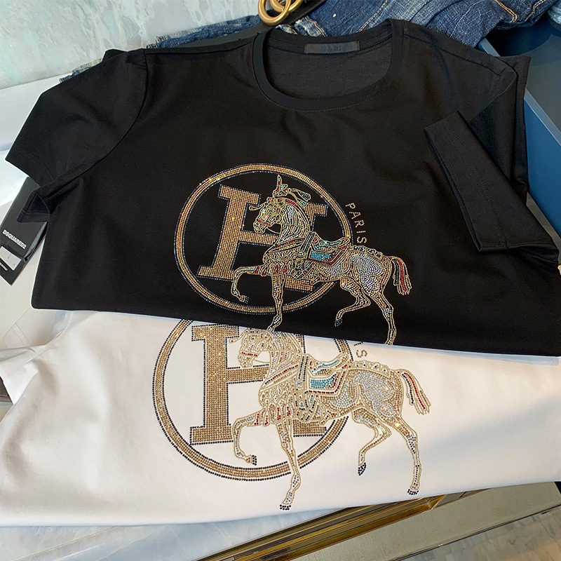 精梳棉欧洲站夏季男士烫钻圆领短袖镶钻潮牌欧货男装半袖t恤