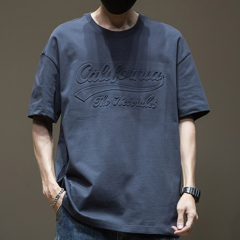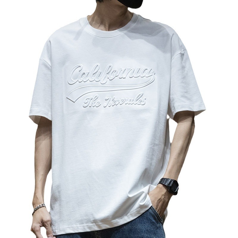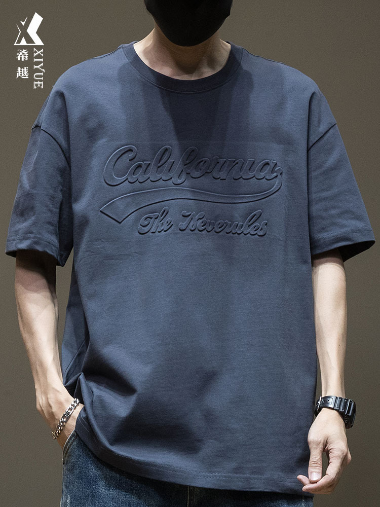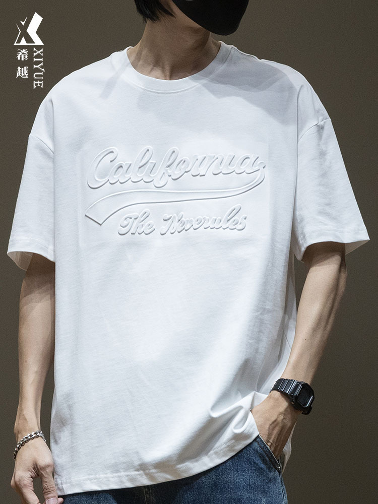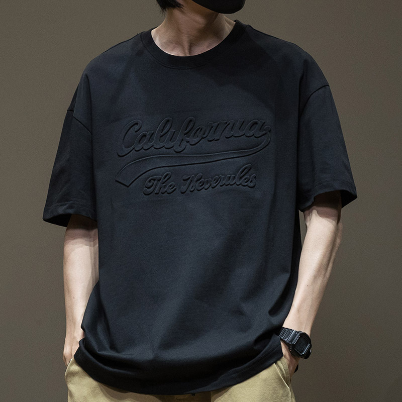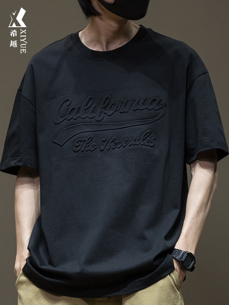 希越夏季日系ins黑色短袖T恤男纯棉宽松大码男装男士钢印男生上衣